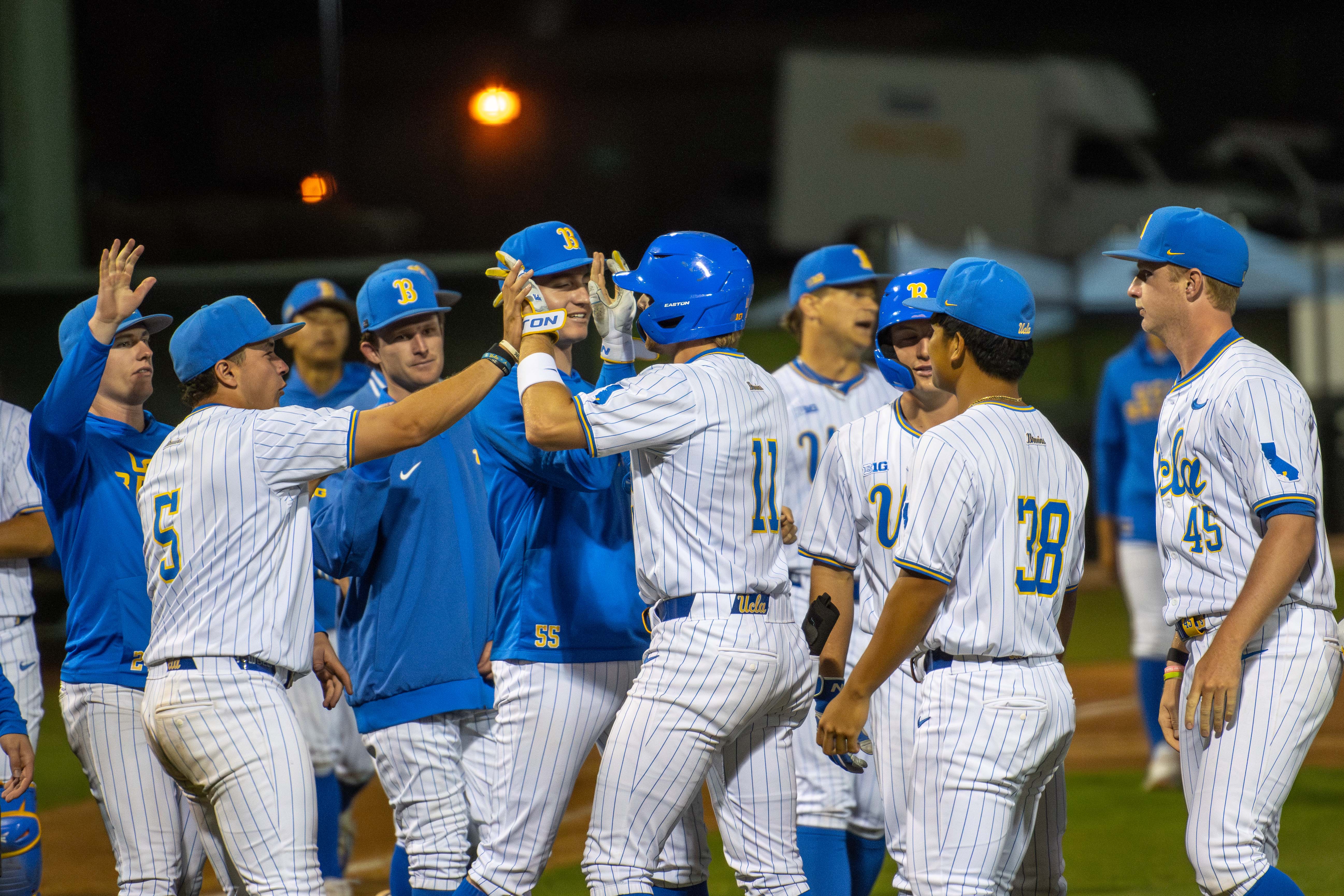 UCLA baseball players high five each other, celebrating their win. (Kai Dizon/Daily Bruin senior staff)