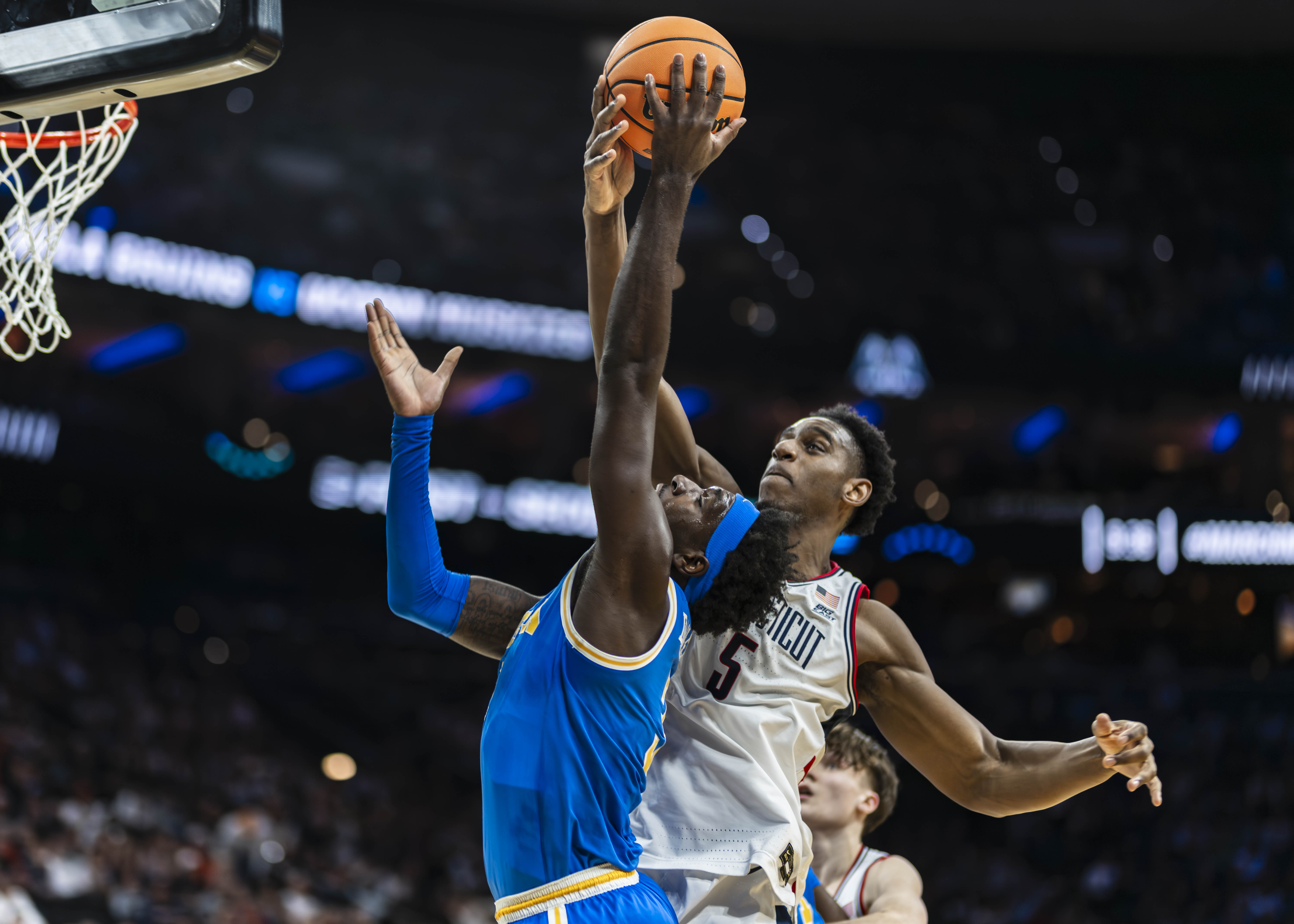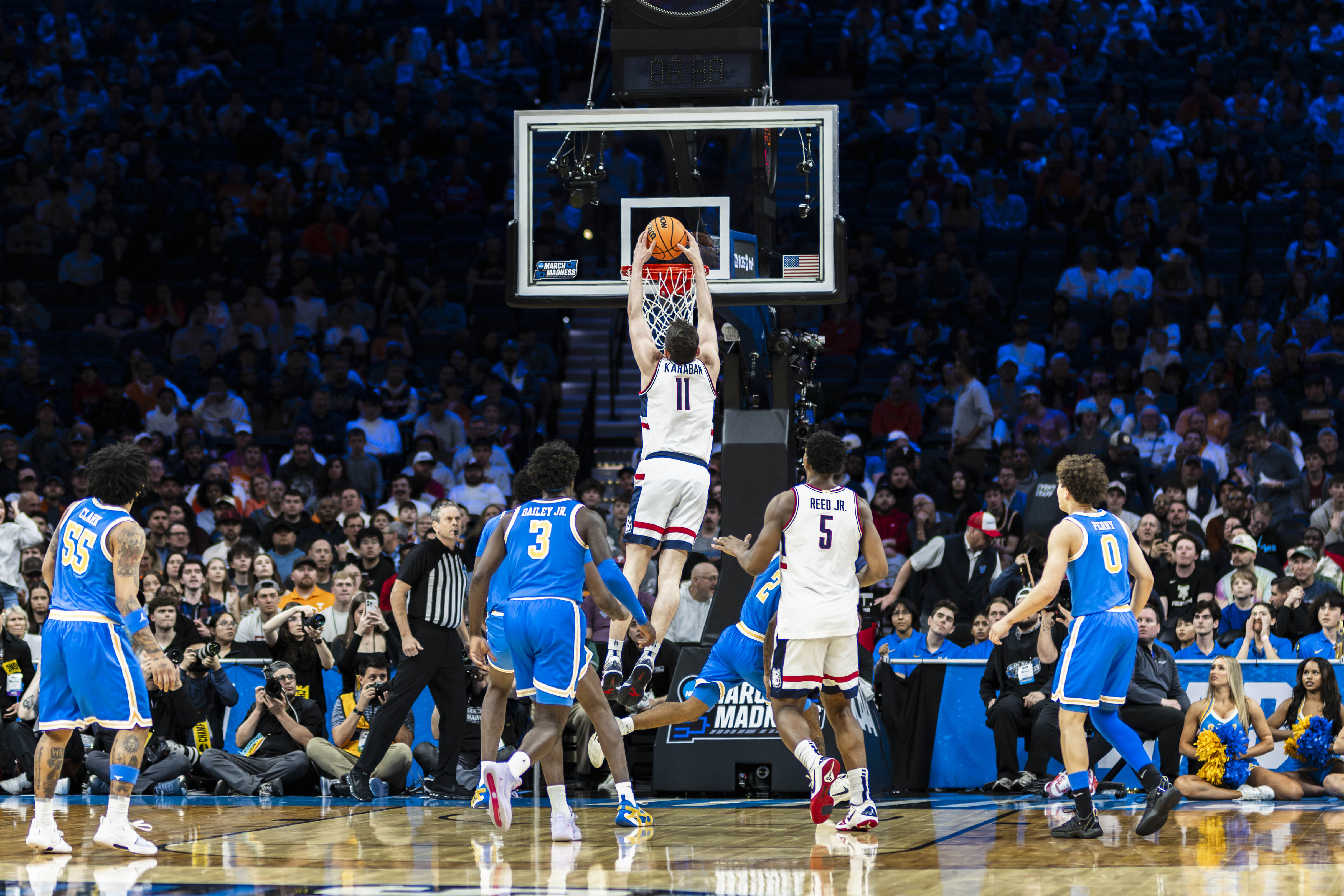 Fueled by 27 points on 9-for-16 shooting from the field from its most experienced player and the chants of U-C-O-N-N from the Husky faithful, No. 2 seed UConn (31-5, 17-3 Big East) knocked No. 7 seed UCLA men’s basketball (24-12, 13-7 Big Ten) out of the NCAA Tournament, winning 73-57 in the Round of 32 of March Madness Sunday night at the Xfinity Mobile Arena in Philadelphia.