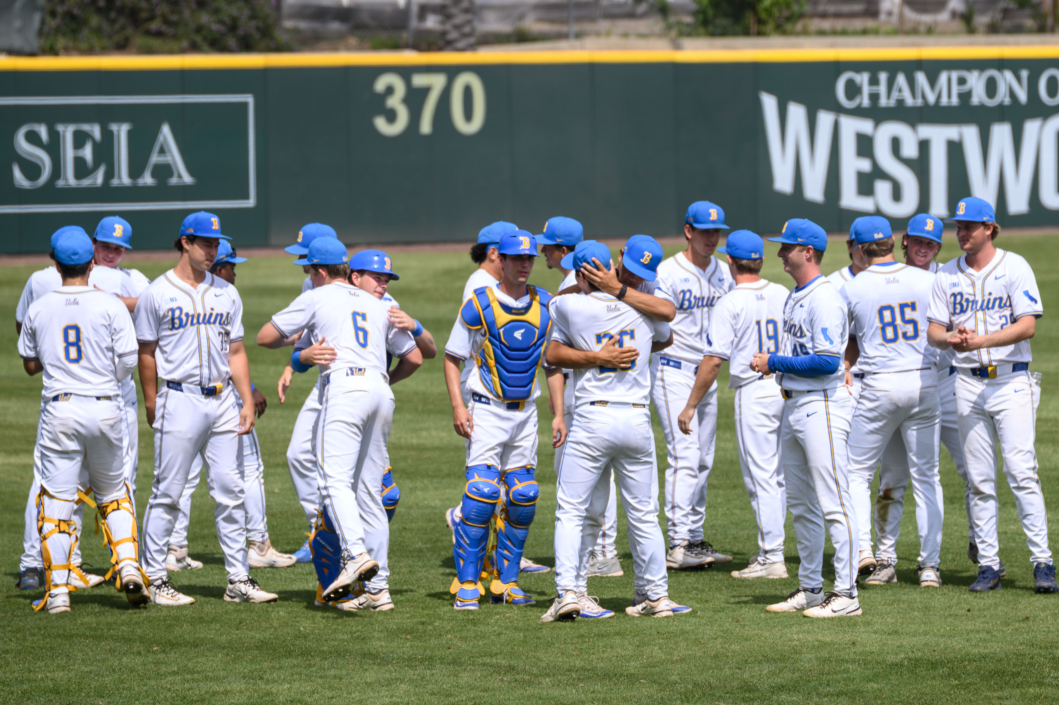 UCLA baseball celebrates on the field. (Kai Dizon/Daily Bruin senior staff)