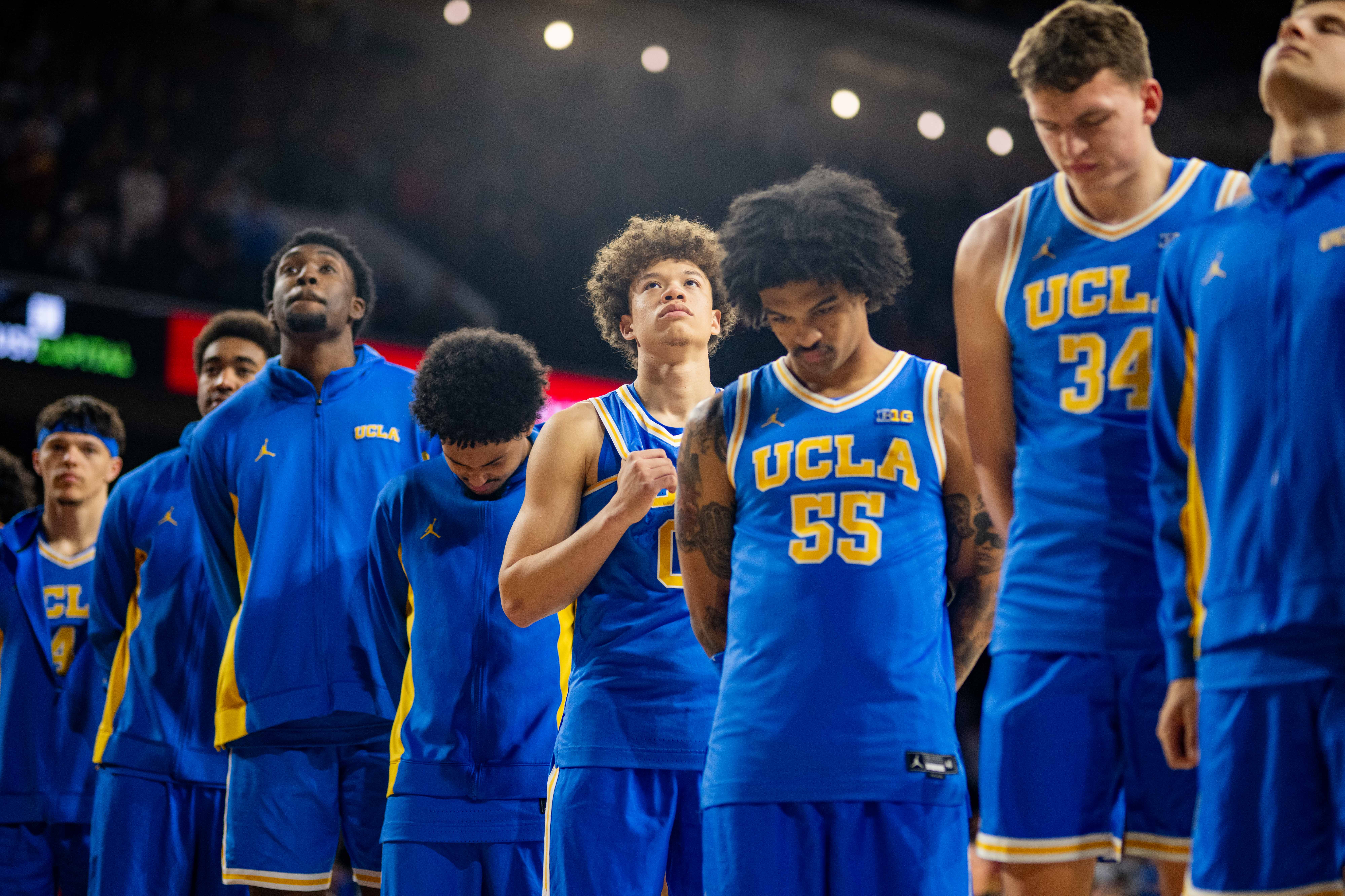UCLA men’s basketball players line up for the national anthem. (Andrew Ramiro Diaz/Photo editor)
