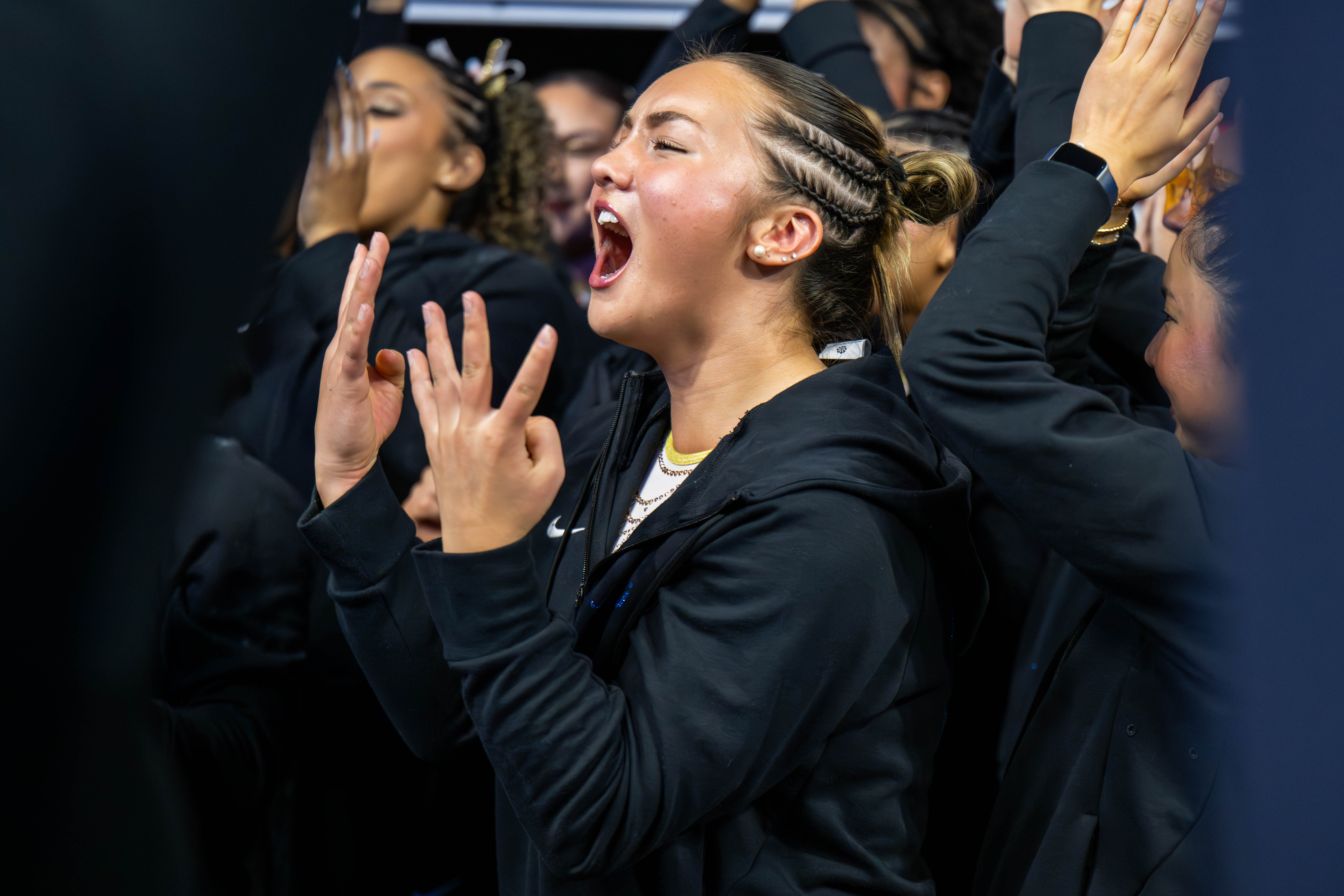 Sophomore Riley Jenkins cheers and holds up fours on both hands. (Zimo Li/Daily Bruin senior staff)