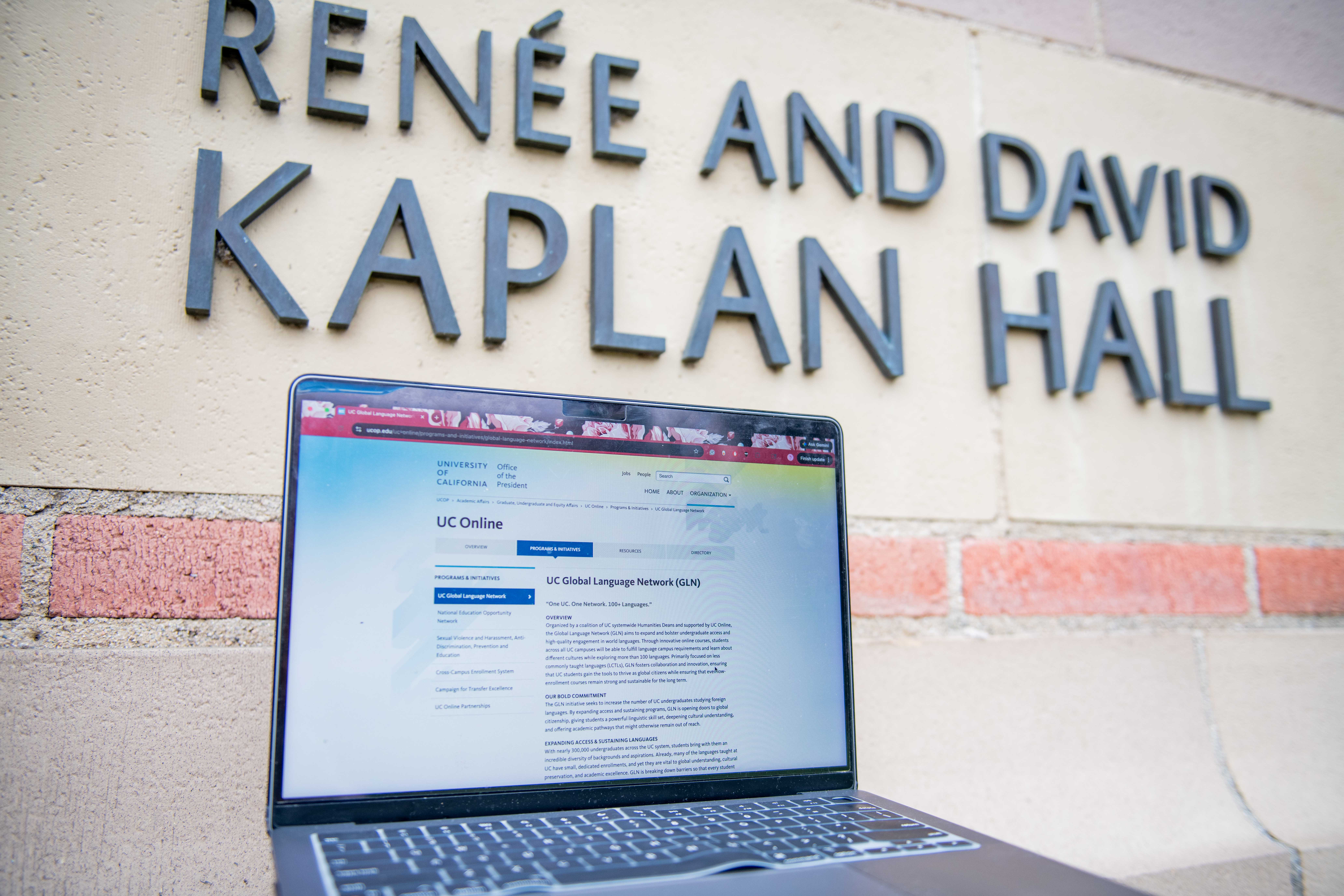 The website for the Global Language Network is displayed on a laptop. The virtual language education initiative has sparked concern among UC instructors. (Joice Ngo/Daily Bruin staff)