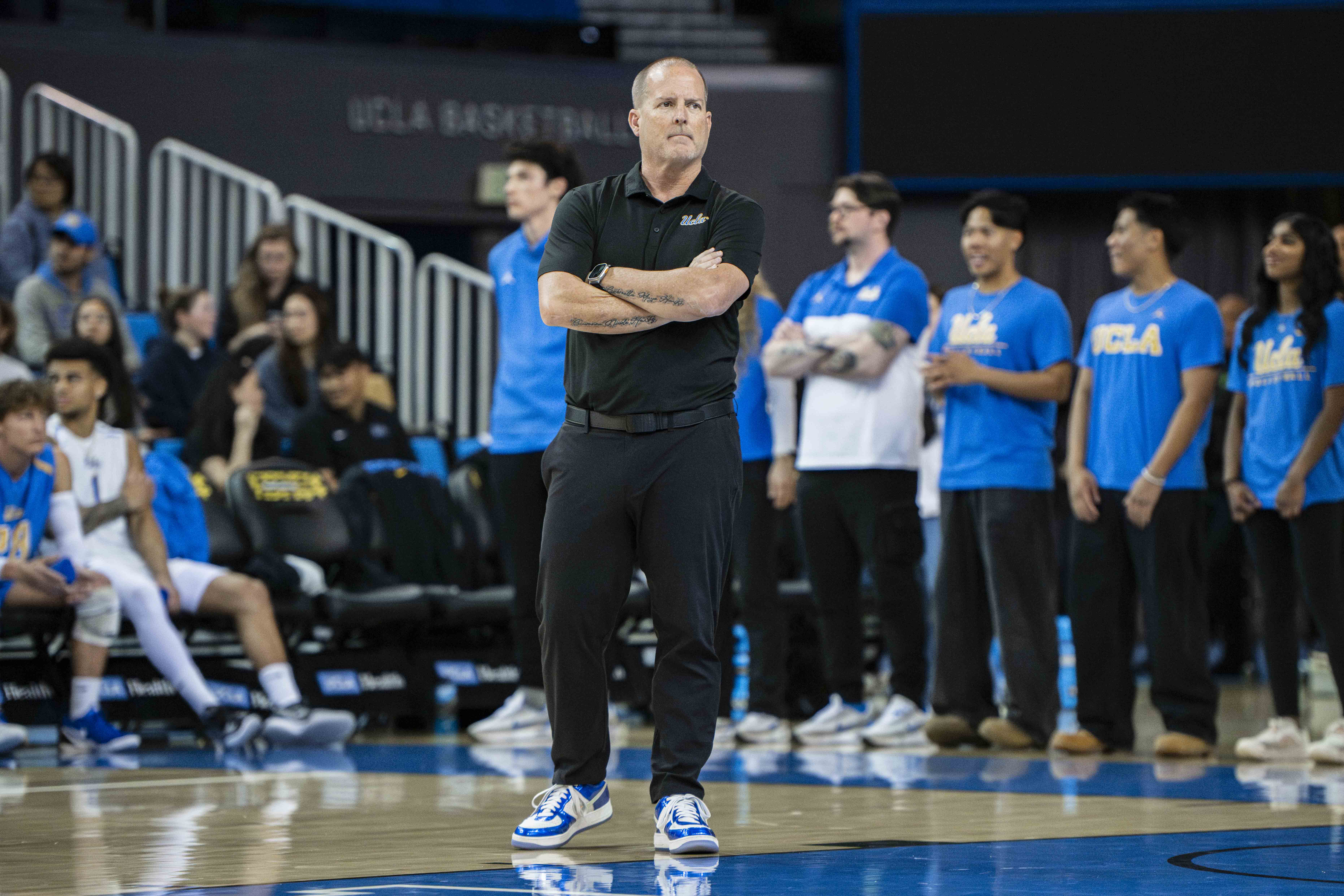 Coach John Hawks stands on the court with his arms crossed. (Crystal Tompkins/Daily Bruin senior staff)