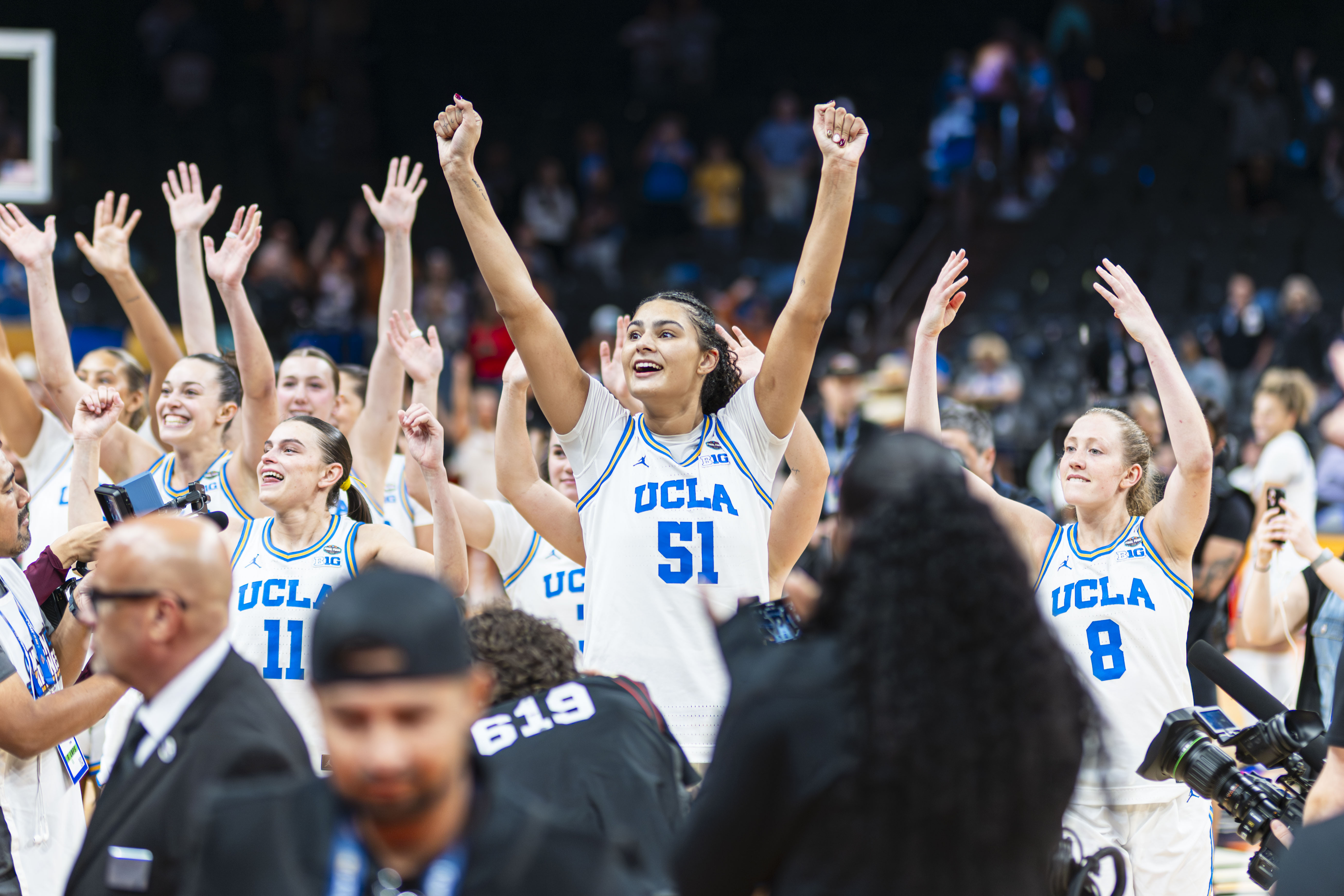Members of No. 1 seed UCLA women’s basketball celebrate and cheer with UCLA fans after defeating No. 1 seed Texas to advance to the national title game. (Aidan Sun/Assistant Photo editor)