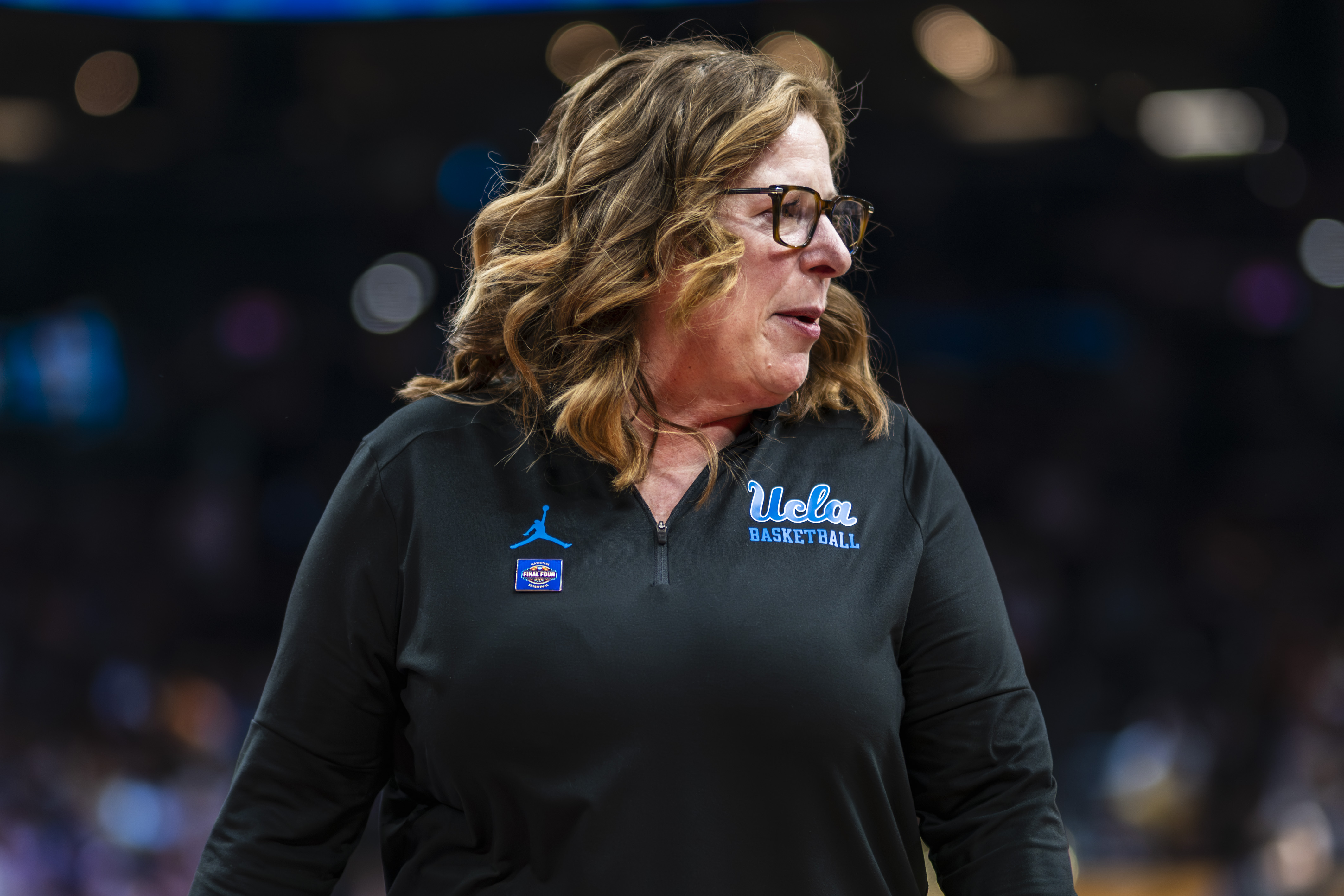 Coach Cori Close walks on the sidelines during Friday’s NCAA tournament semifinal game. Close has led UCLA to consecutive Final Four appearances, the only two in program history. (Aidan Sun/Assistant Photo editor)