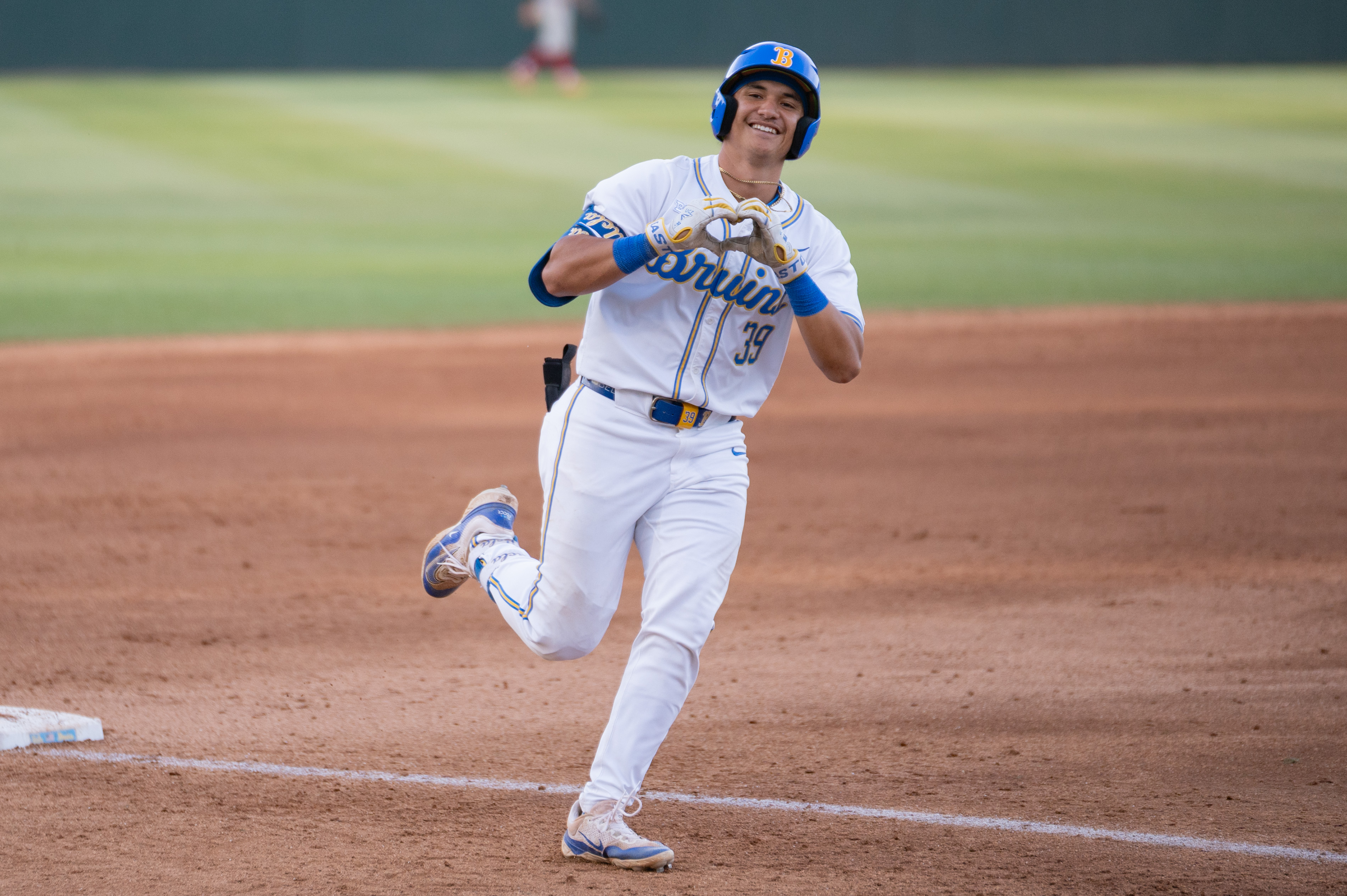 Junior first baseman Mulivai Levu runs around the bases holding his hands in the shape of a heart. (Kai Dizon/Daily Bruin senior staff)