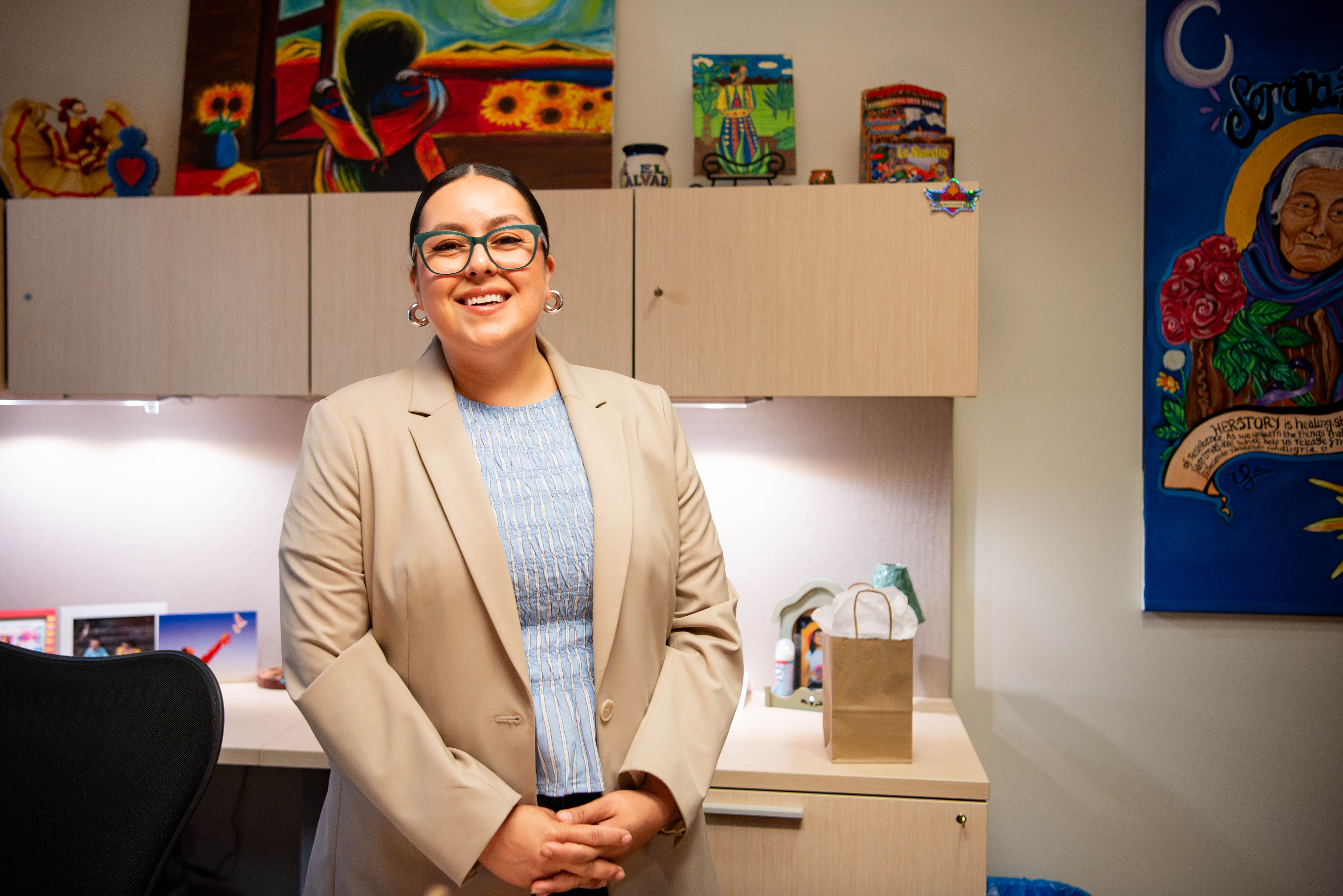 Arlene Cano Matute, the inaugural director of the Latinx Success Center, stands in front of artwork made by students. The center celebrated its one year anniversary March 31.(Victor Simoes/Daily Bruin)
