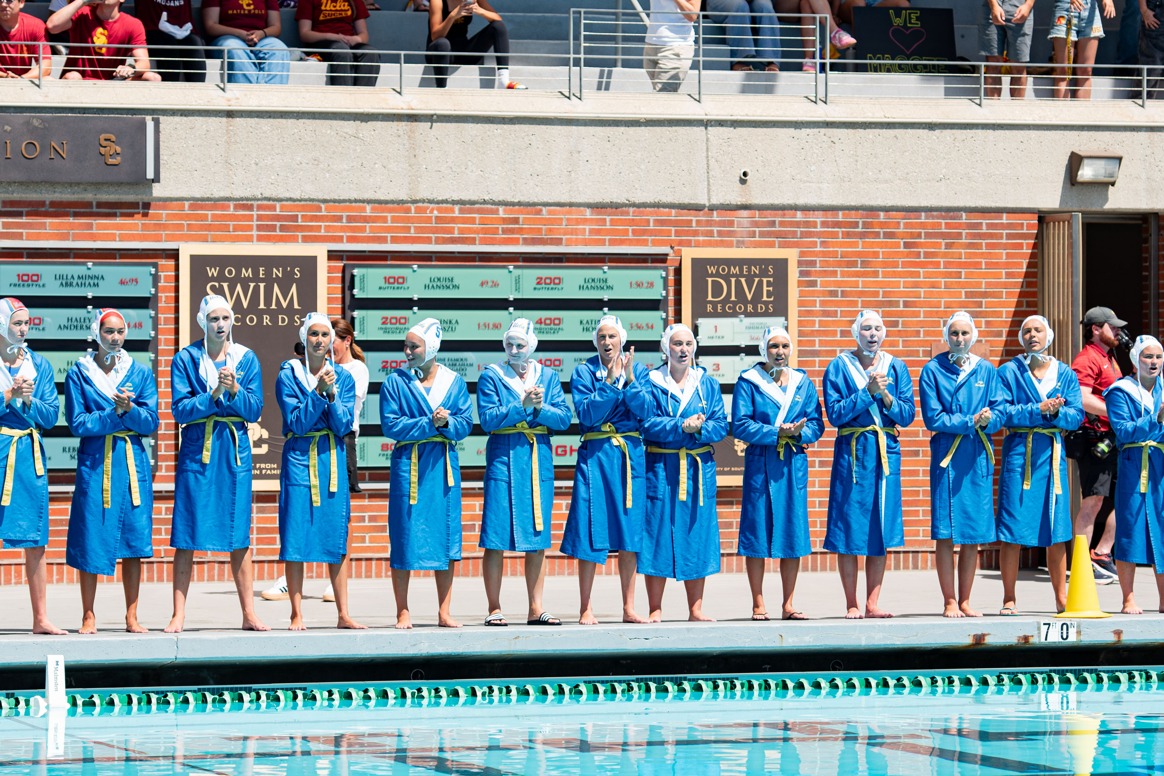 UCLA women’s water polo stands and claps during the pregame announcements. (Ruby Galbraith/Daily Bruin staff)