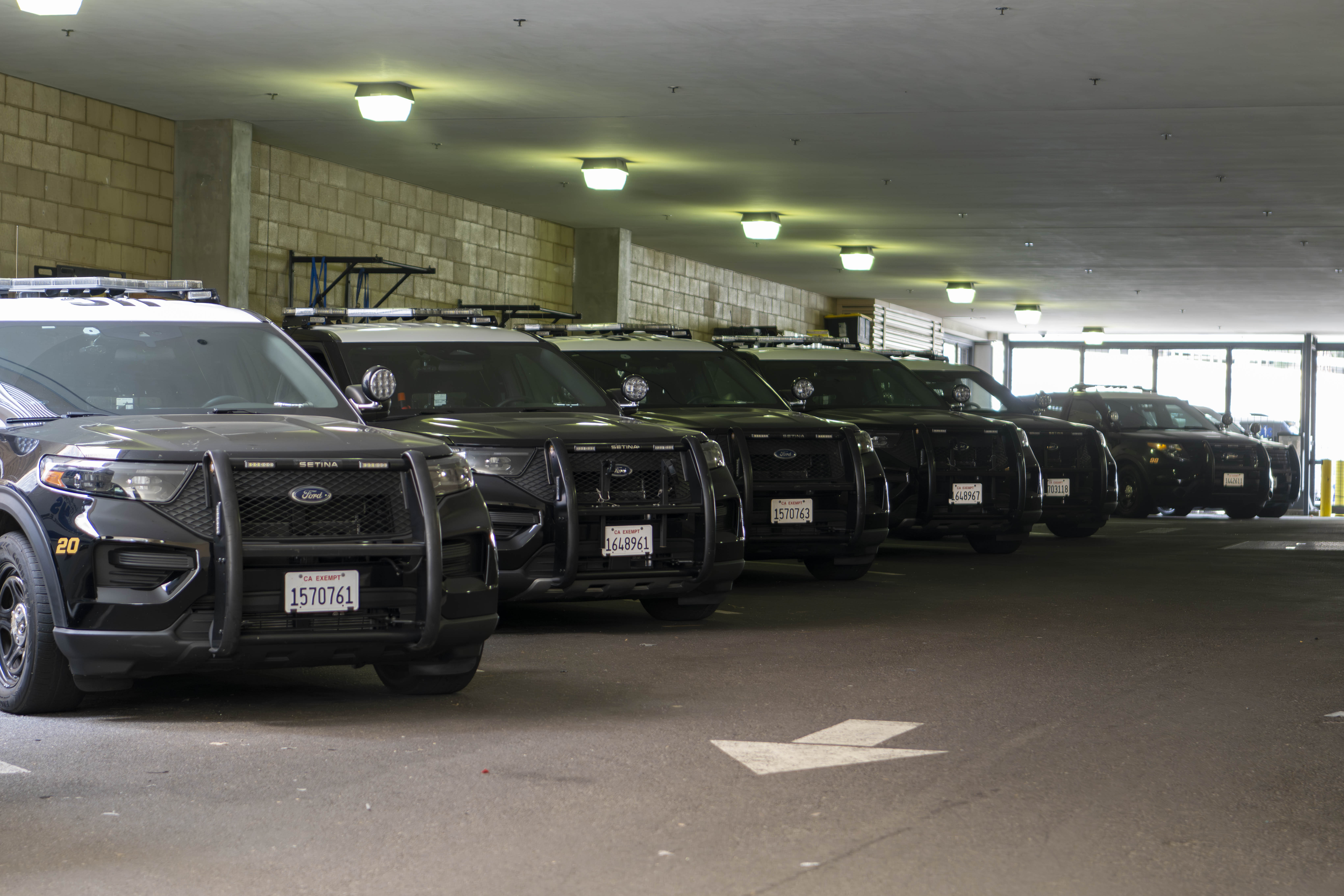 A line of UCPD cars is shown in a parking lot. More than half of the people UCPD stopped between July 2024 and June 2025 were Black or Hispanic, data showed. (Crystal Tompkins/Daily Bruin senior staff)