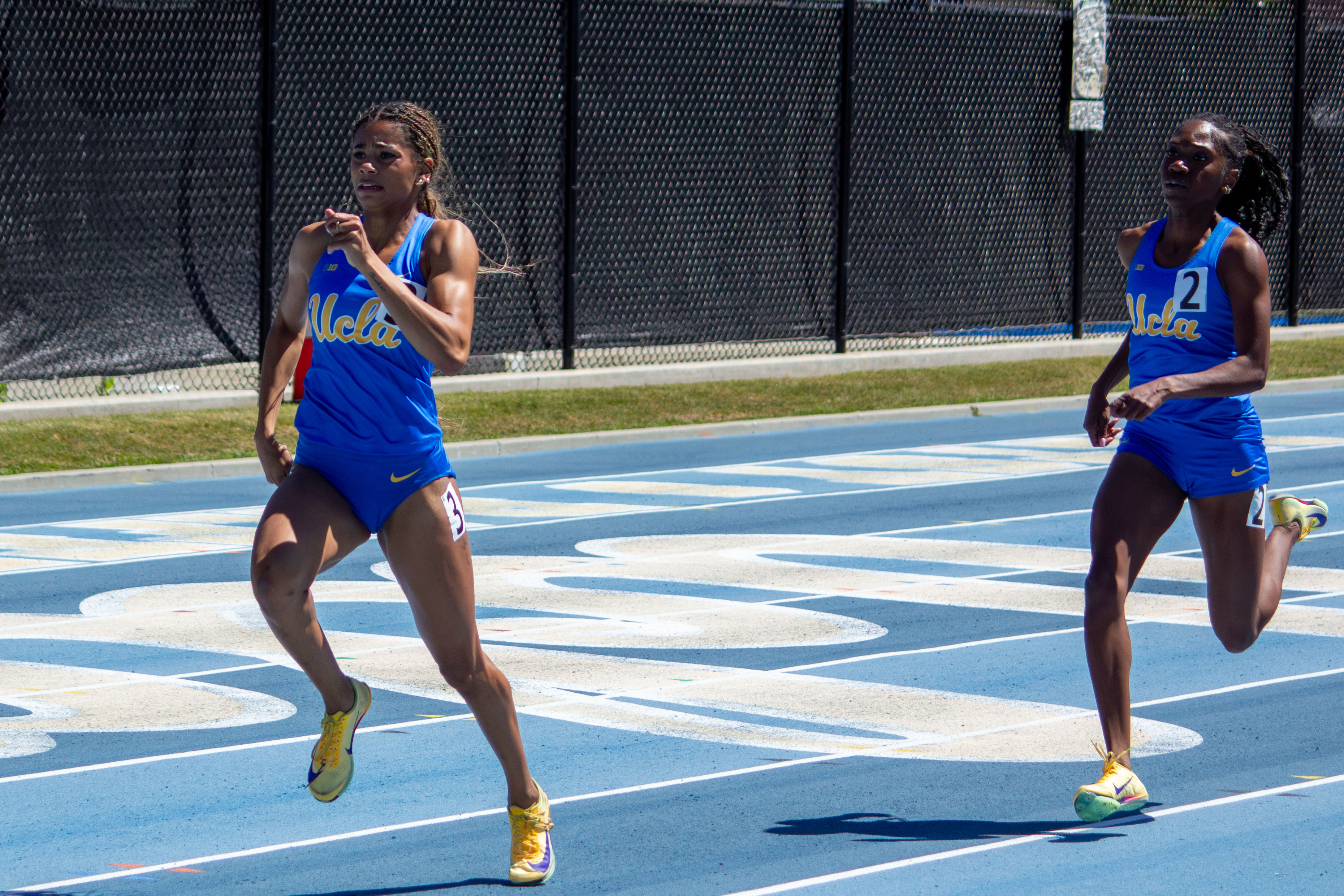 Sprinters sophomore Kayla McBride (left) and junior Ava Simms sprint in the women’s 200-meter dash. McBride took first place in the event with a 23.85-second mark, and Simms finished in seventh place with a time of 24.27 seconds. (Pranav Akella/Daily Bruin)