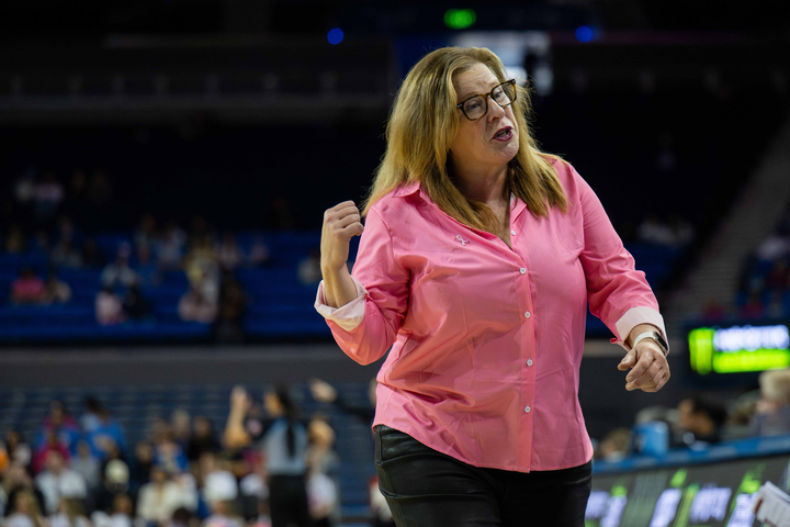 Coach Cori Close talks to players on the bench during a UCLA women’s basketball game. Close has acquired three guards from the transfer portal in the last week. (Michael Gallagher/Assistant Photo editor)