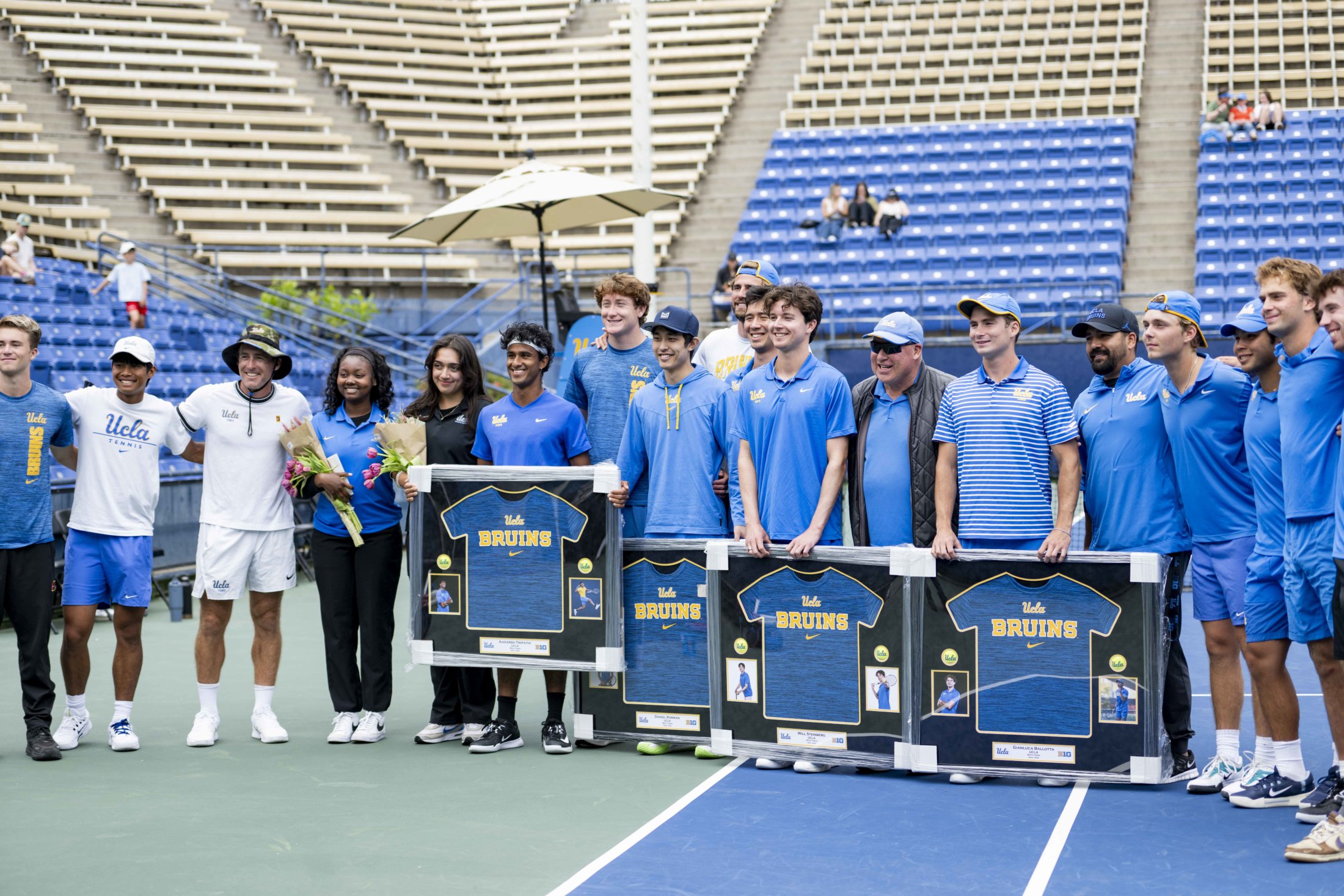 Bruin seniors Will Steinberg, Tripathi and Ballotta were honored following doubles play, receiving commemorative frames after the coaching staff delivered personal speeches.