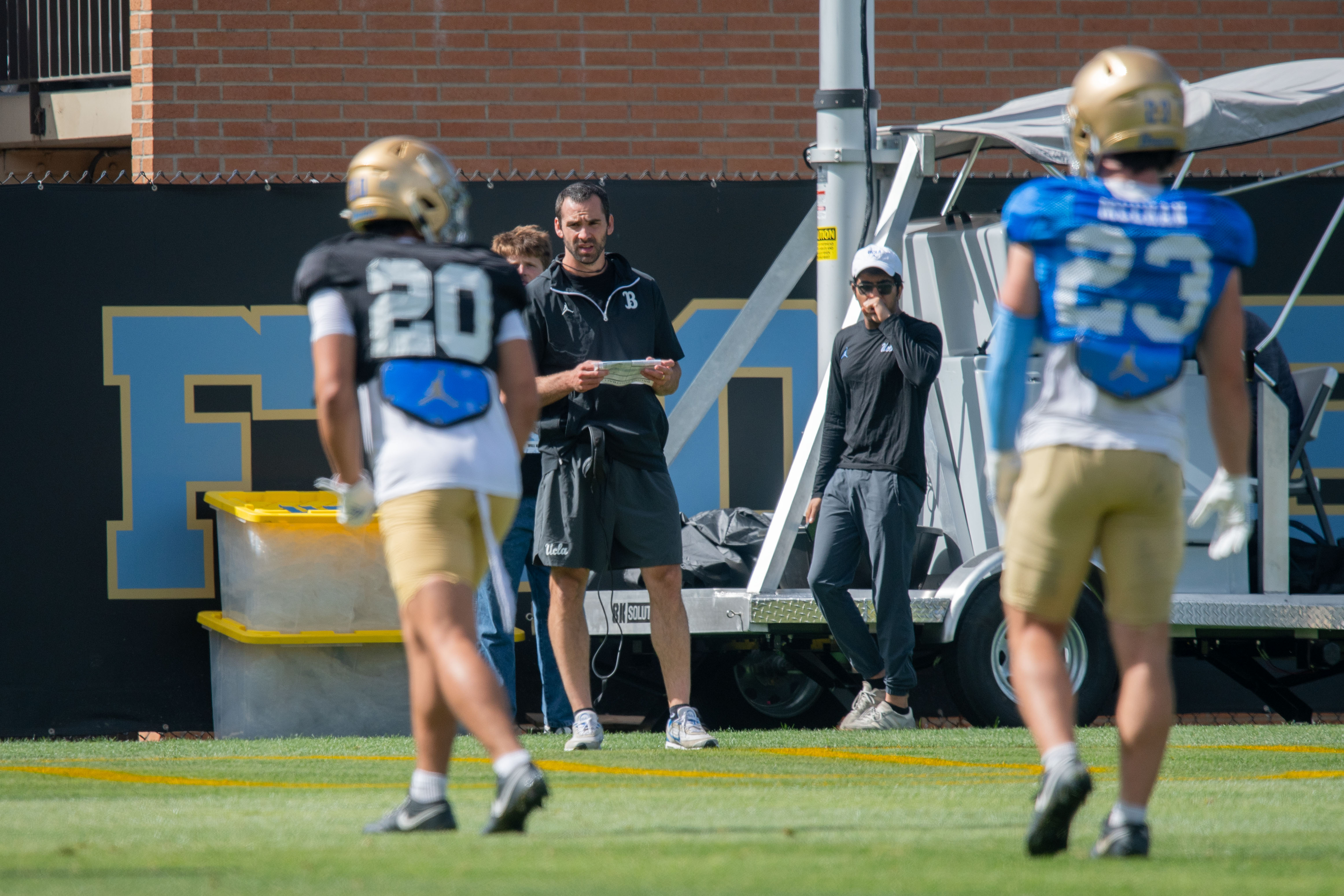 UCLA football offensive coordinator Dean Kennedy holds a play-calling sheet and watches players on Spaulding Field. (Kai Dizon/Daily Bruin senior staff)