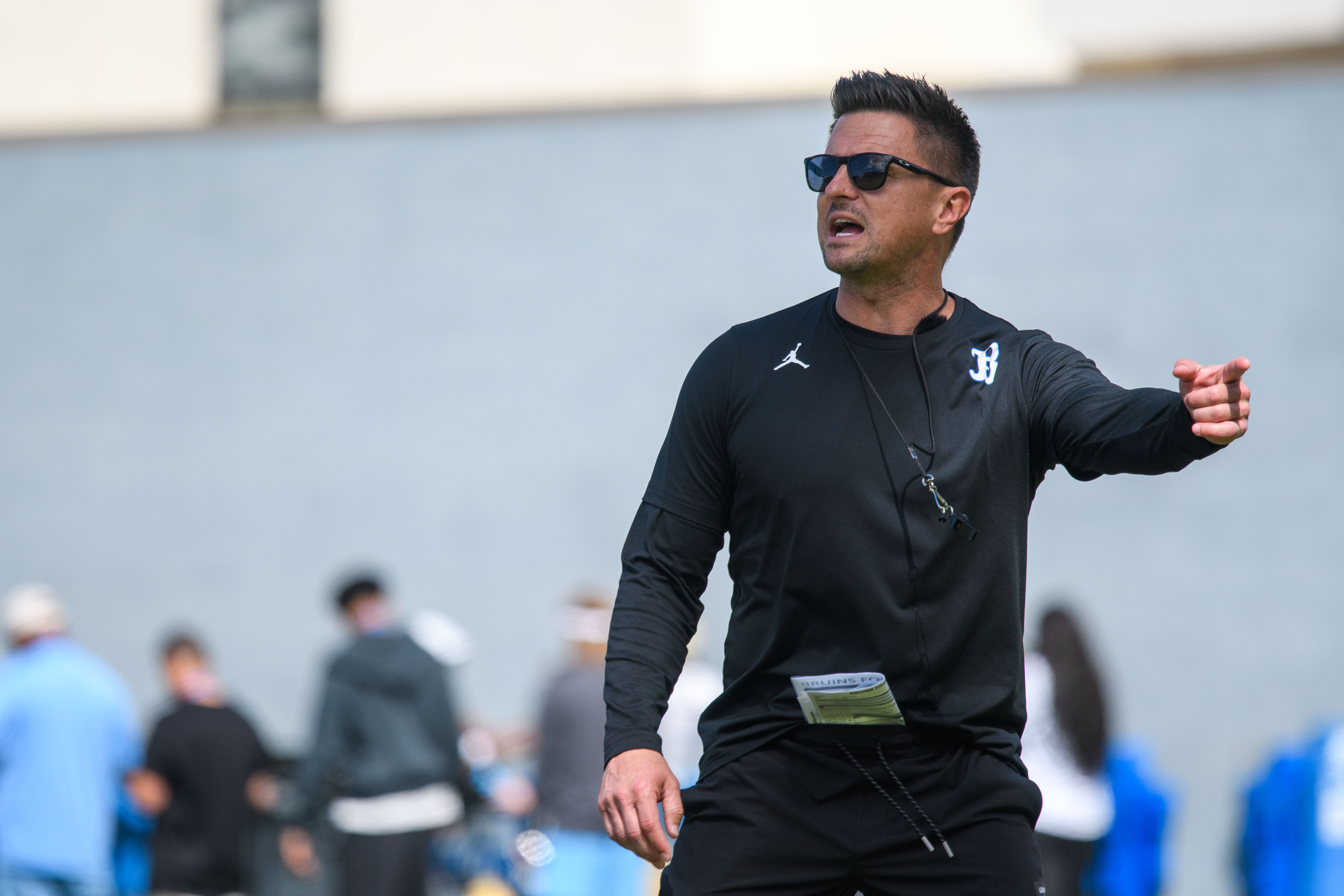 UCLA football head coach Bob Chesney points his finger as he stands on the field. (Kai Dizon/Daily Bruin senior staff)