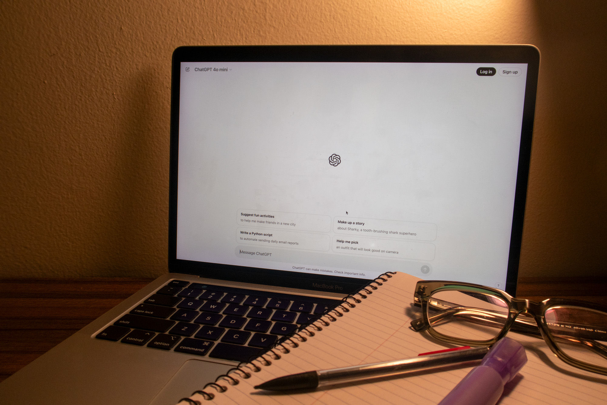 A notebook, glasses, school supplies and a computer with ChatGPT open are pictured. Columnist Tenley Hill argues UCLA should teach students how to use AI to support their education. (Daily Bruin file photo)