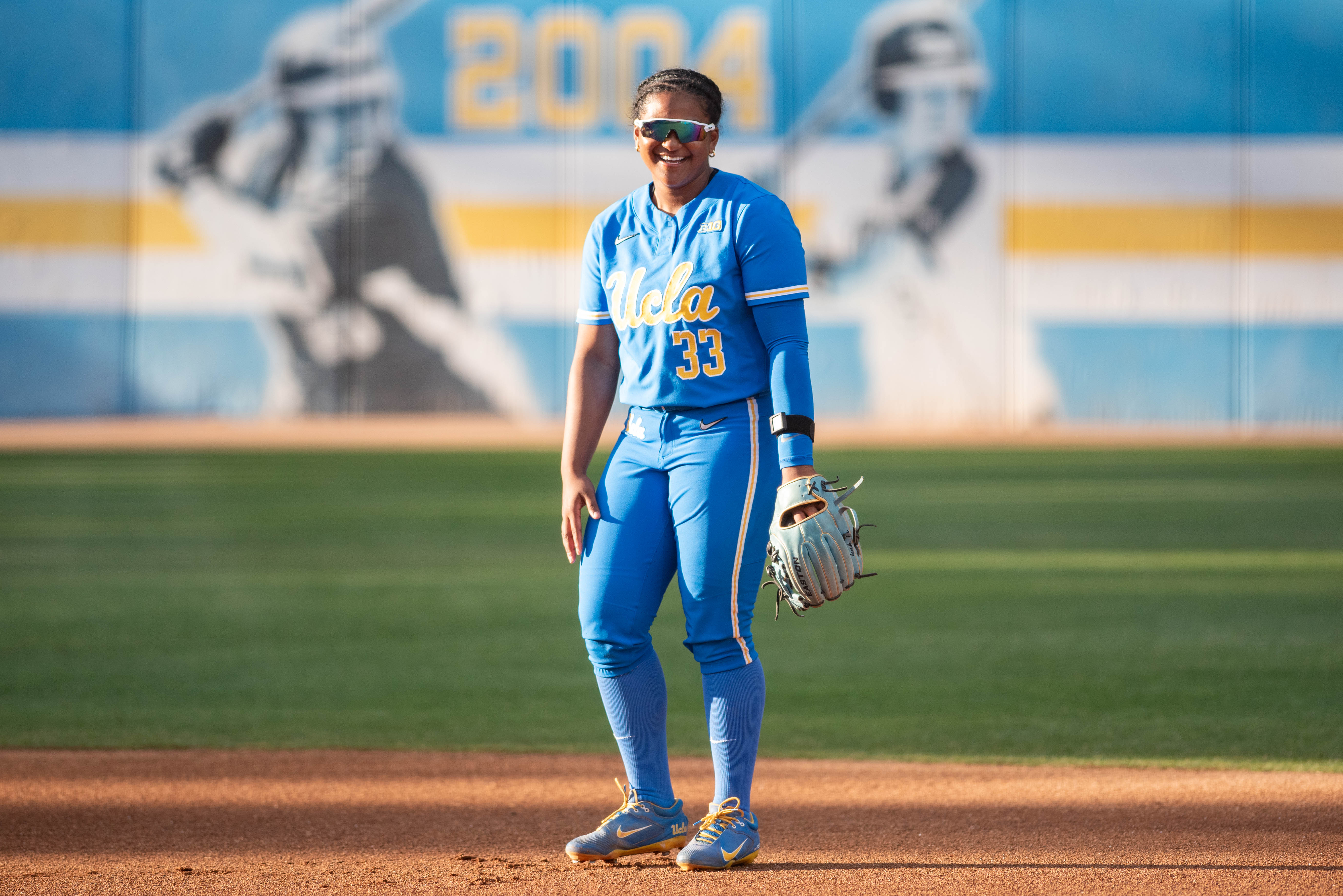 Sophomore infielder Kaniya Bragg smiles while standing in the field. She plays alongside fellow infielders senior Jordan Woolery, redshirt freshman Aleena Garcia and freshman Bri Alejandre. (William Gauvin/Daily Bruin)