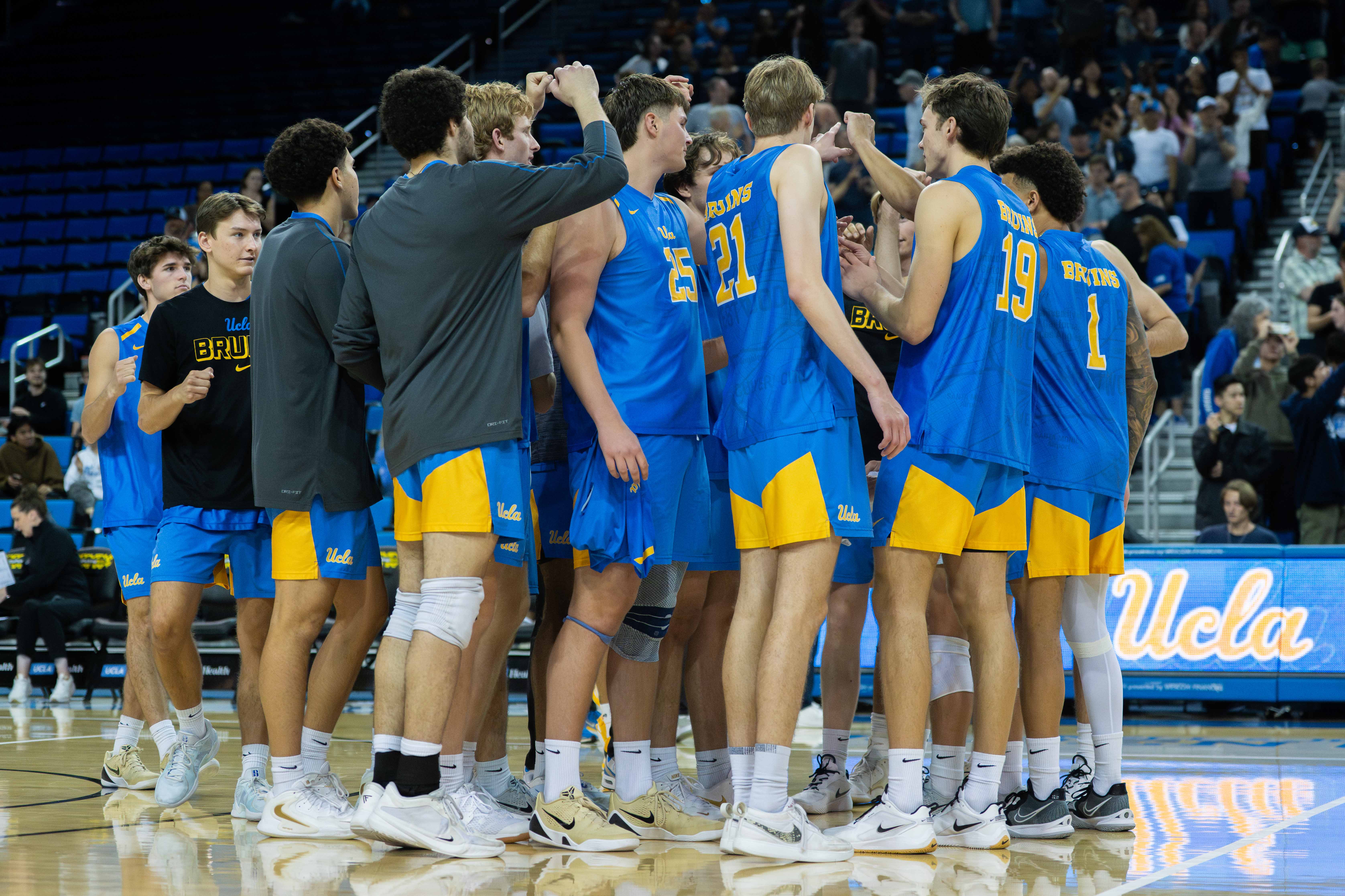 UCLA men’s volleyball comes together in a full team huddle on the court. (Crystal Tompkins/Daily Bruin senior staff)