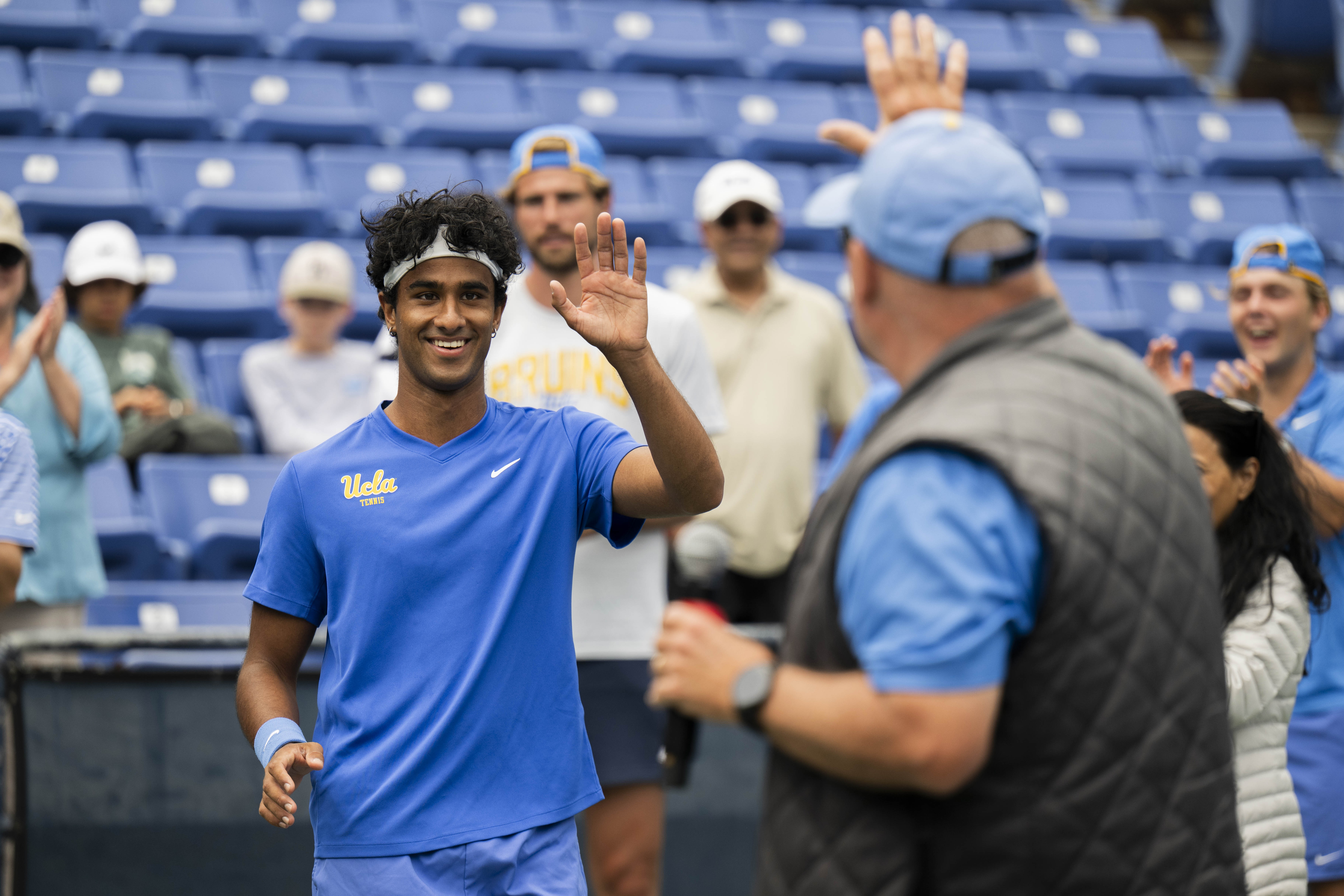 Senior Aadarsh Tripathi (left) waves to coach Billy Martin (right). (Leydi Cris Cobo Cordon/Daily Bruin senior staff)