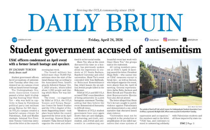 The Daily Bruin publishes print issues every Monday, Wednesday and Friday during the school year. You can view the online version of The Bruin here.