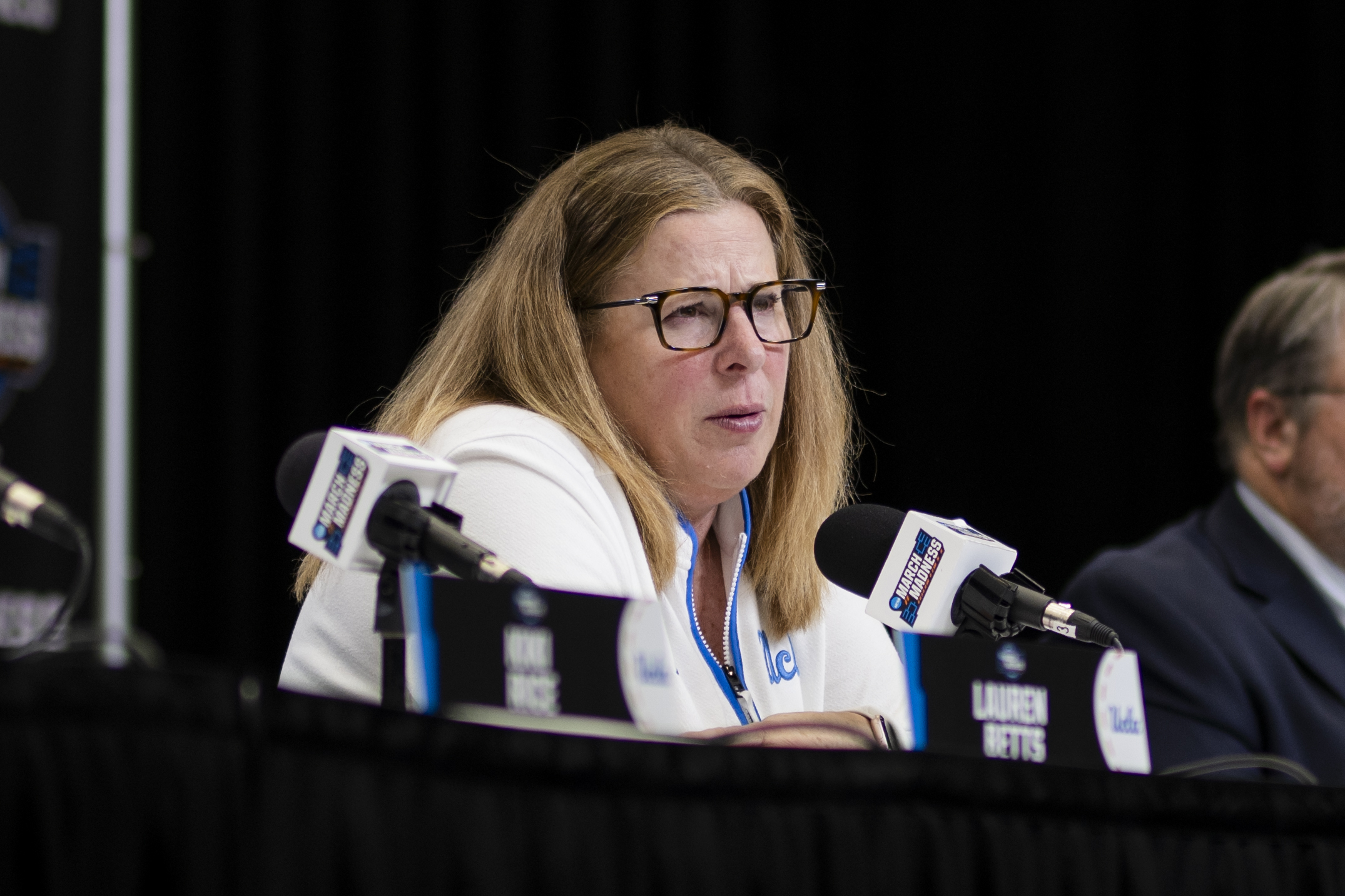 Coach Cori Close answers questions during a NCAA Tournament press conference. (Andrew Ramiro Diaz/Photo editor)