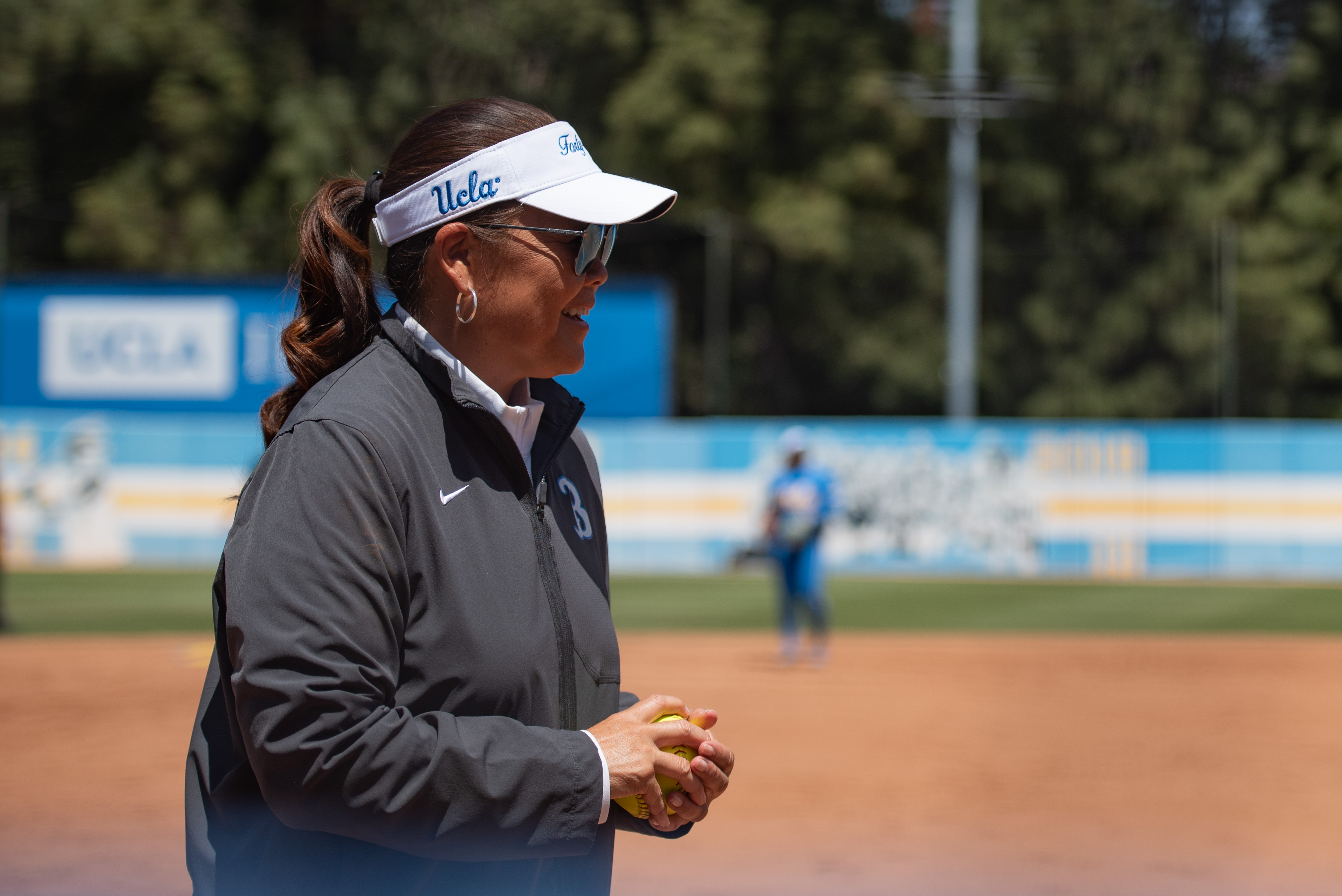 Coach Kelly Inouye-Perez stands outside the dugout and smiles. Perez has led the Bruins to a 41-5 record this season, and the squad’s last loss was to Nebraska on March 29. (Presley Liu /Daily Bruin)