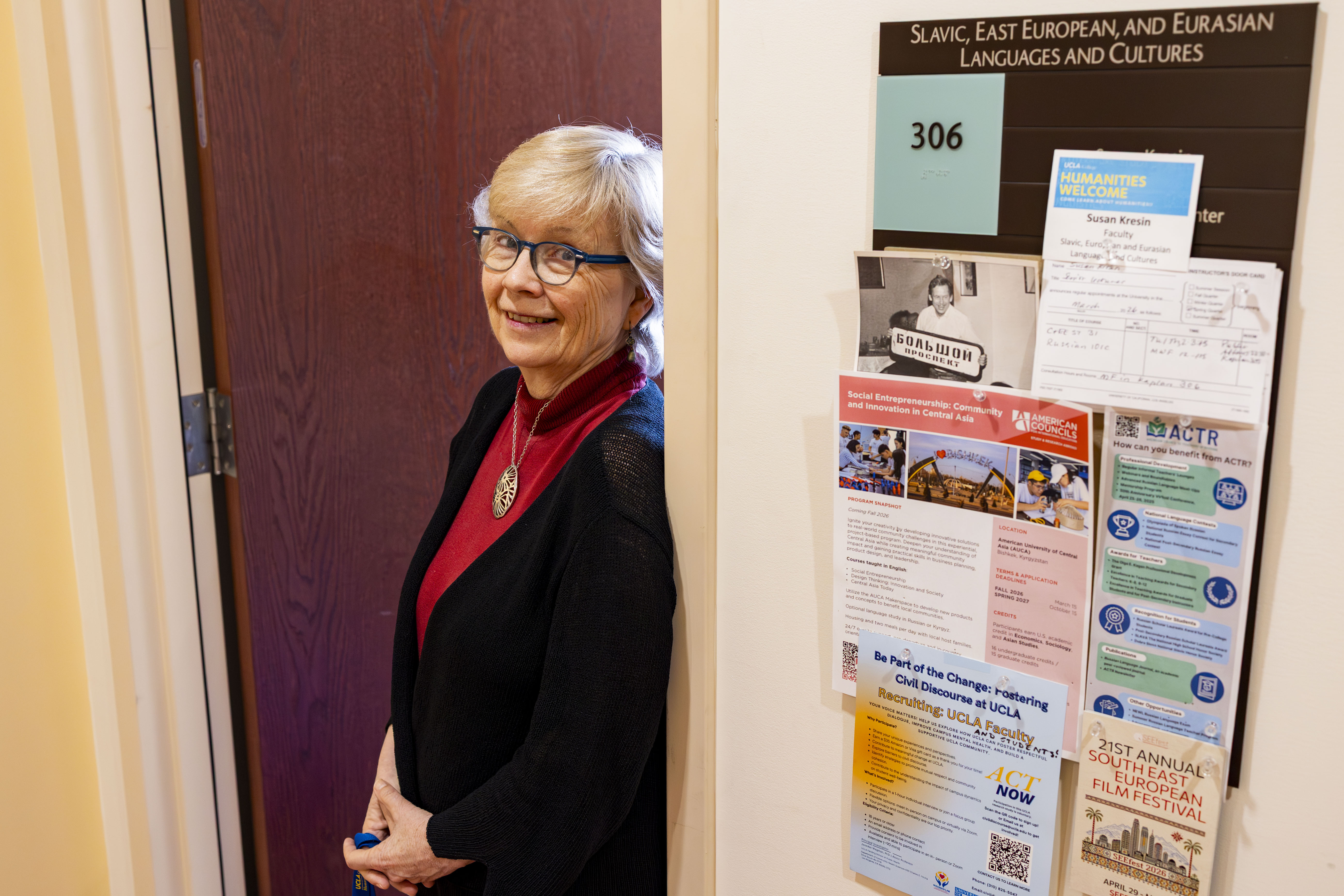 Susan Kresin, a senior lecturer in Russian and Czech, stands by a doorway. Kresin, who joined UCLA faculty in 1996, received a national award for expanding Russian and Slavic language education. (Chenrui Zhang/Daily Bruin staff)