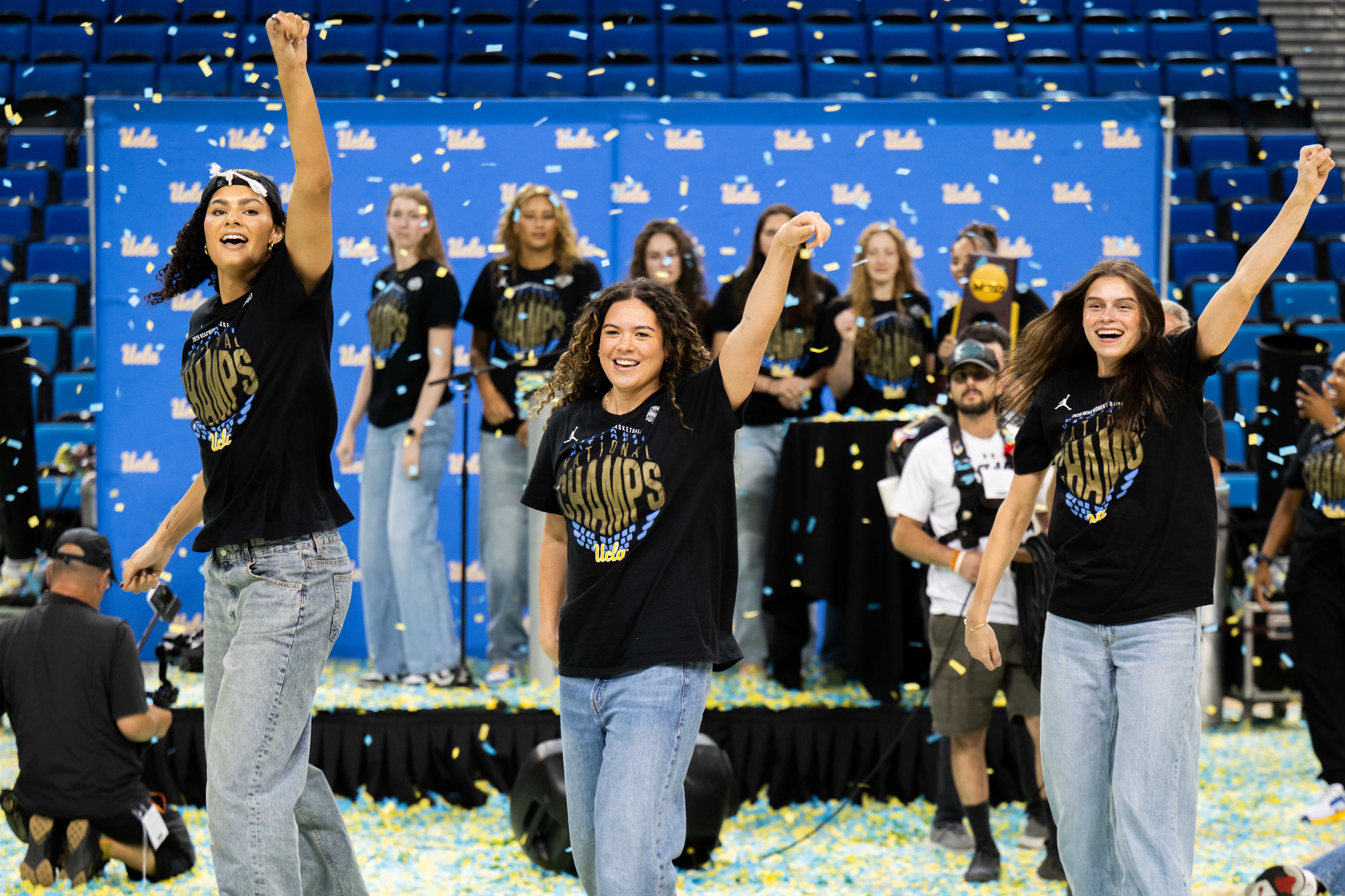 Senior center Lauren Betts, graduate student guard Charlisse Leger-Walker and senior guard Gabriela Jaquez (left to right) dance to “Just Keep Watching” by Tate McRae during a celebratory event at Pauley Pavilion. (Michael Gallagher/Assistant Photo editor)