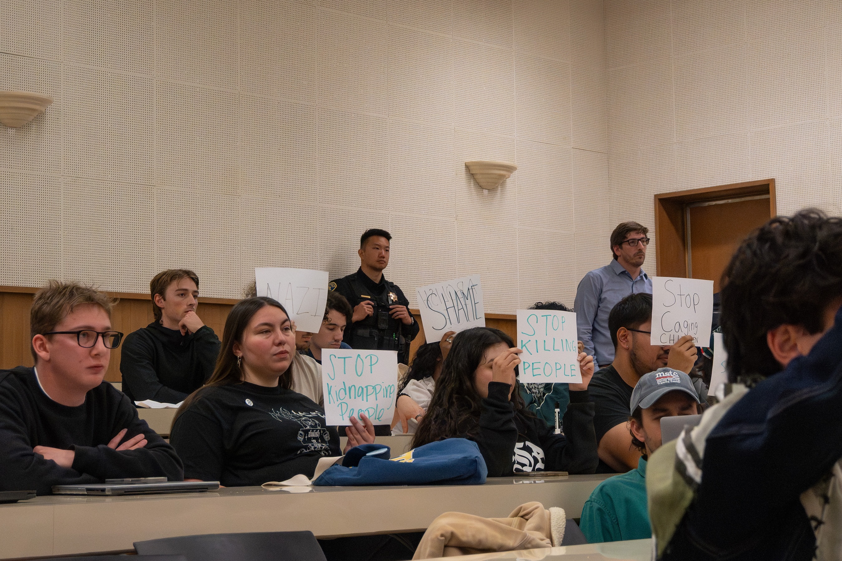 Demonstrators hold up signs during an event with James Percival, the general counsel of the United States Department of Homeland Security, including some which read, “Stop killing people” and “Stop kidnapping people.” (Karla Cardenas-Felipe/Daily Bruin staff)