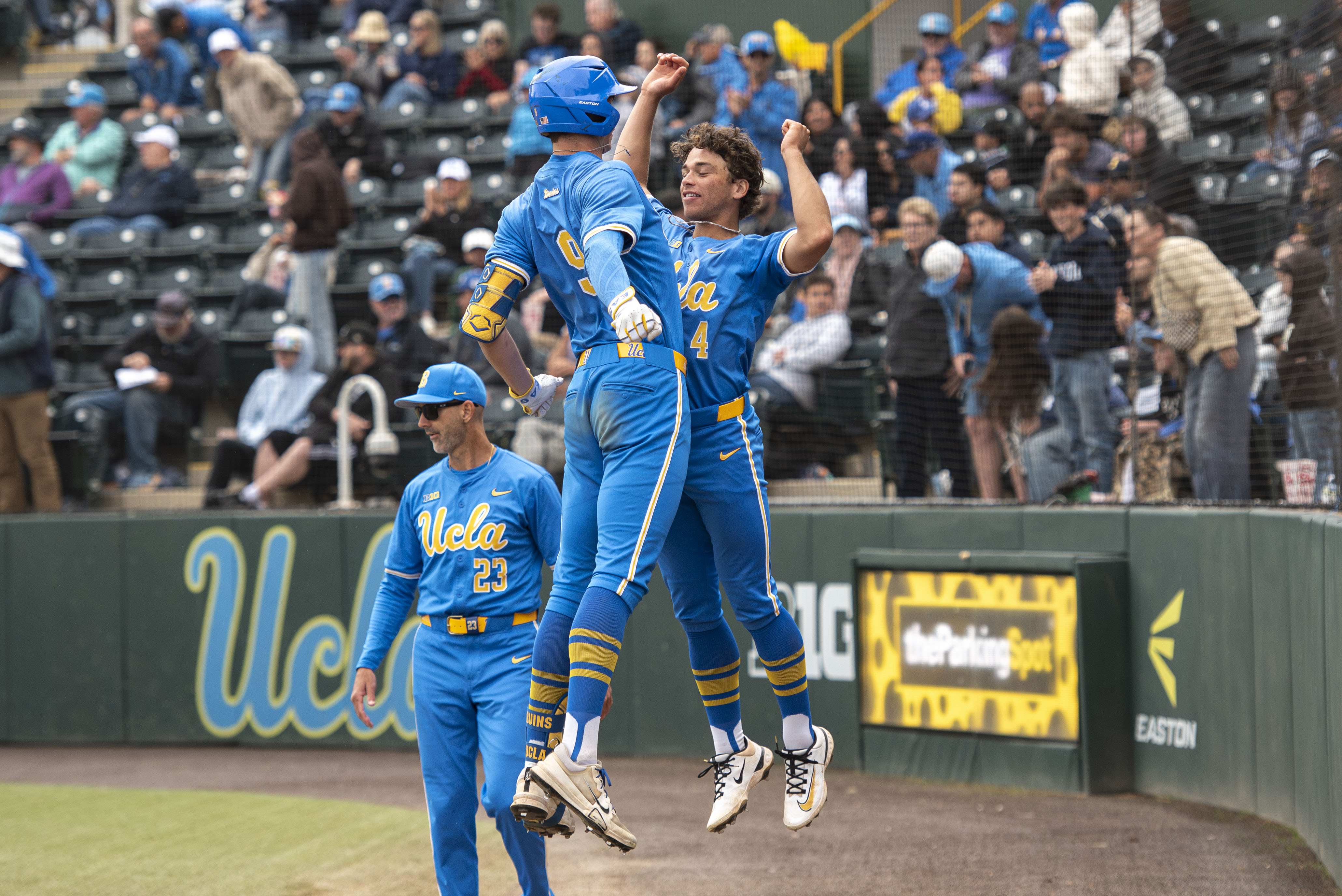 Juniors center fielder Will Gasparino and second baseman Phoenix Call jump up to chest bump each other. (Alexis Muchnik/Daily Bruin)