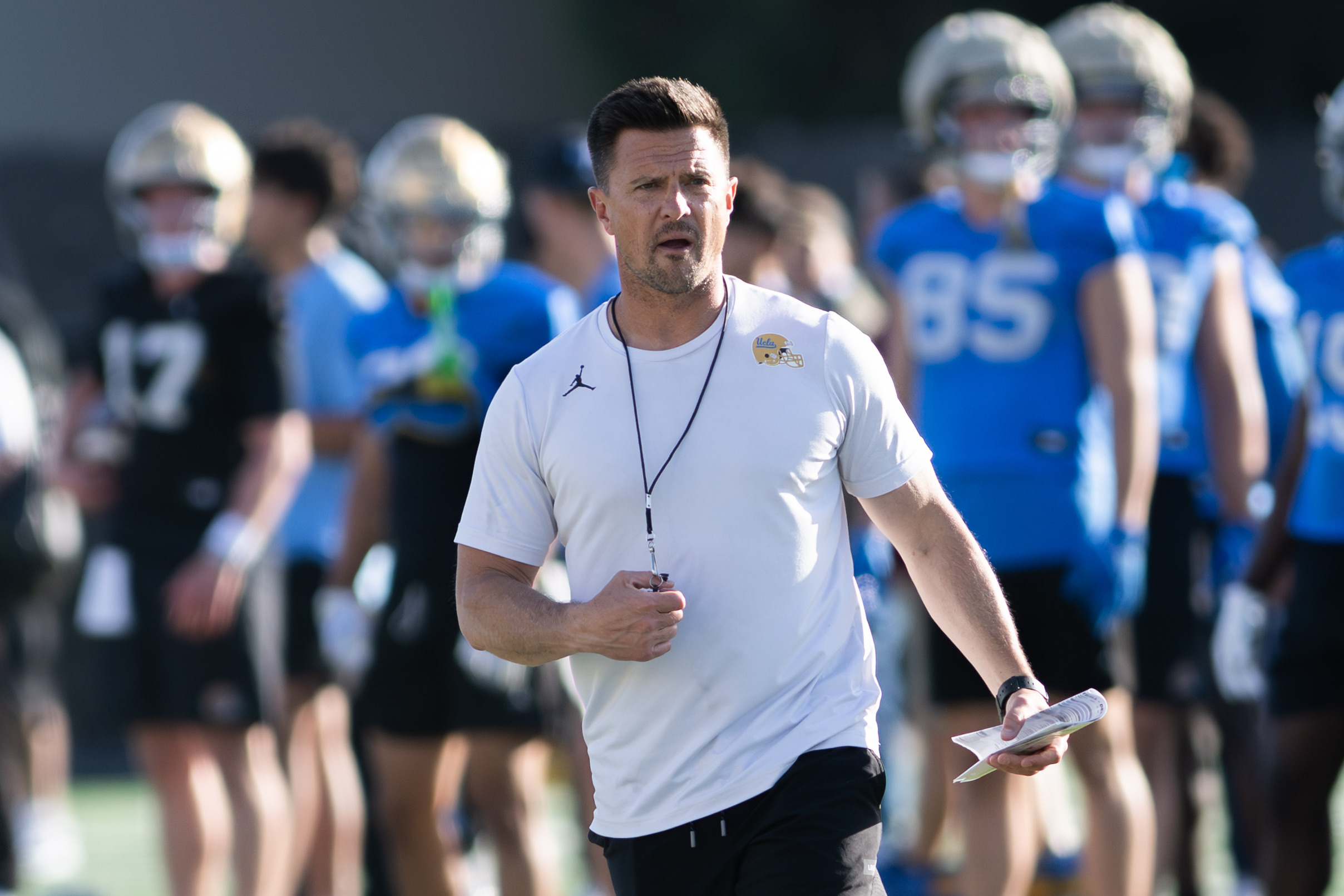 UCLA football coach Bob Chesney walks while holding his whistle. (Leydi Cris Cobo Cordon/Daily Bruin senior staff)