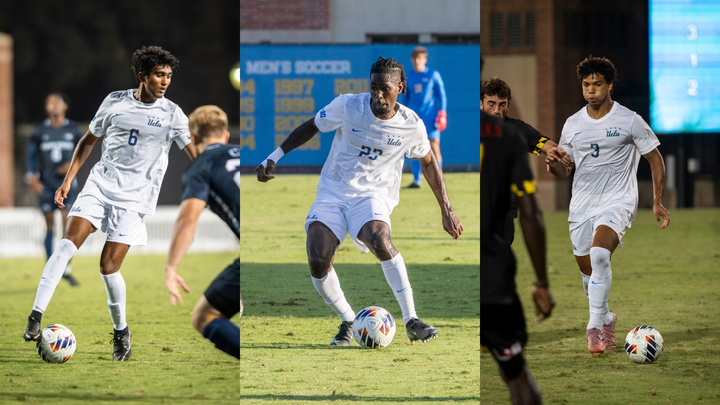 Senior midfielder Tarun Karumanchi dribbles the ball (left), graduate student defender Schinieder Mimy controls a ball with his left foot (middle) and junior defender Tre Wright eyes the field (right). All three Bruins were selected in the second round of the MLS SuperDraft on Thursday. (Leydi Cris Cobo Cordon/Daily Bruin senior staff)