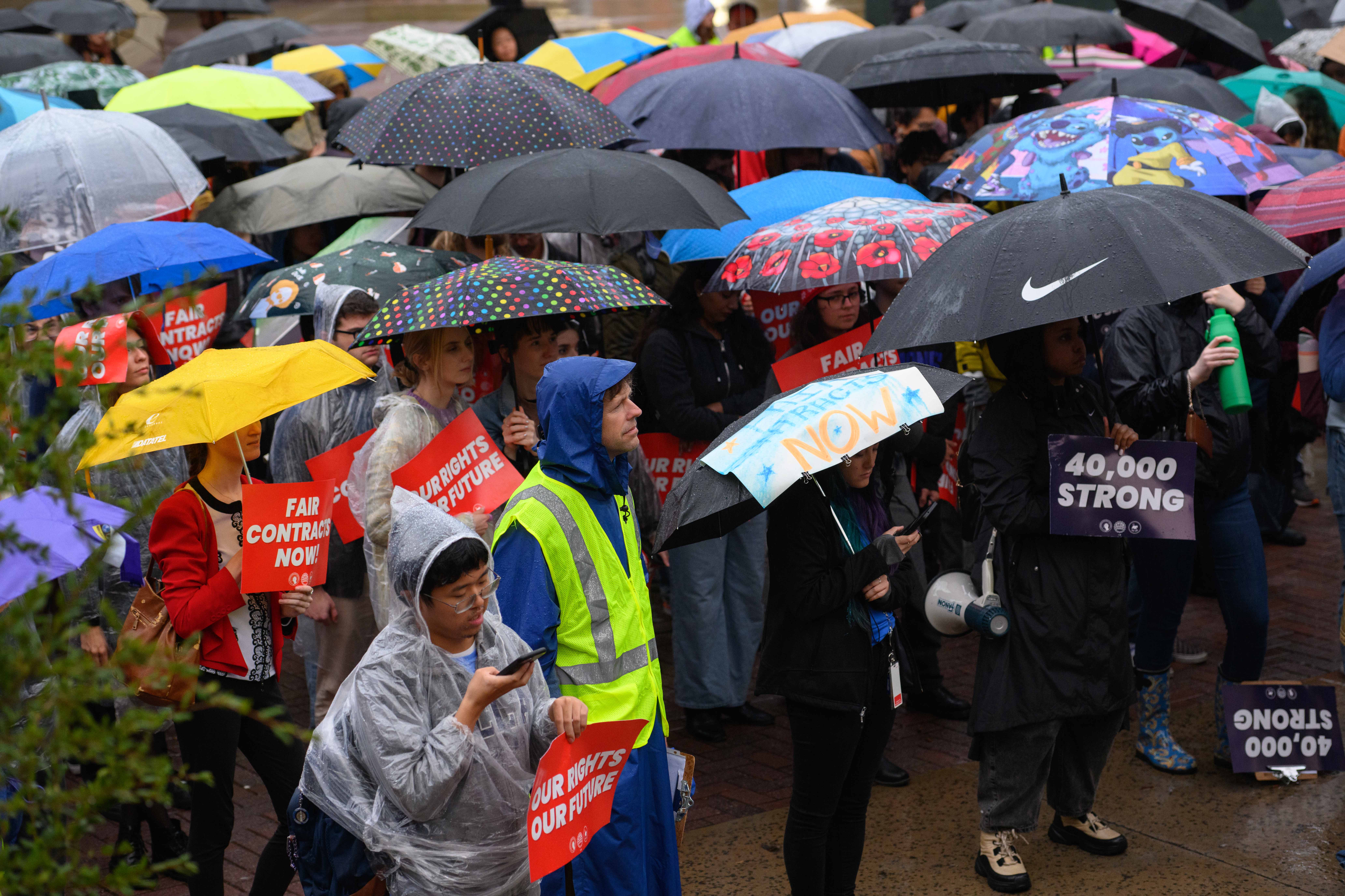 The union began the rally around noon, with multiple leaders speaking in support of a petition outlining its demands for international workers that has at least 10,000 signatories and was delivered to UC administrators and campus leaders earlier in the day.